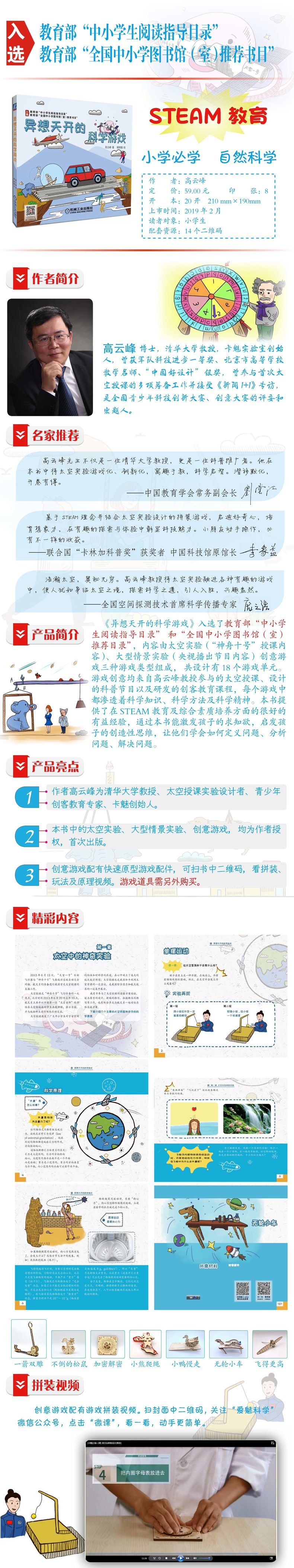 序 高云峰:“至则万物生”卷 前言 教育理念及卡魅实验室 第一章 太空中的神奇实验 单摆运动 陀螺运动 水膜变水球 第二章 地面上的失重游戏 地面上的漂浮 失重下的火焰 柠出失重的水 第三章 不可思议的大型游戏 纸桥过车 纸船载人 手机吊冰箱 弹簧秤称大象 第四章 一起玩创意游戏 隔空取物 加密解密 一箭双雕 小熊爬绳 飞得更高 不倒的松鼠 小鸭慢走 无轮小车