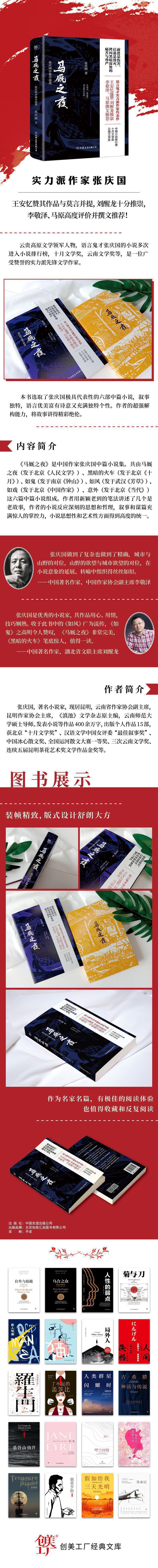 《马厩之夜》是中国作家张庆国中篇小说集。共由马厩之夜(发于北京《人民文学》)、黑暗的火车(发于北京《十月》)、如鬼(发于南京《钟山》)、如风(发于武汉《芳草》)、如戏(发于北京《中国作家》)、意外(发于北京《当代》)这六篇中篇小说组成。作者用新颖老到的笔法讲述了几个是老故事,作者的小说反应深刻的思想和哲理,叙事和谋篇充满惊人的掌控力,小说思想性和艺术性方面得到高度的统一。