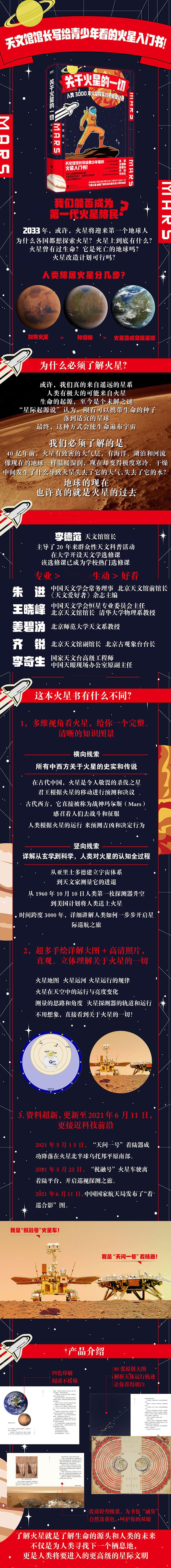 多维度、多视角带你看 火星,搭建完整知识网。 中西方所有关于火星的 史实和传说。从古中国到古 代西方,从东方的荧惑星到 西方的战神星,完整描述人 类如何根据火星的运行来预 测吉凶和决定行为。 时间跨度3000年,从玄 学到科学,详解人类对火星 的认知全过程。从亚里士多 德建立宇宙体系到航天器登 陆火星实地勘探,看人类如 何一步步开启星际巡航之旅 。 80张手绘详解图+高清照 片,直观、立体理解关于火 星的一切。 地貌特征,运行规律, 改造火星,古人研究火星的 珍贵记录……不用想象,直 接看到关于火星的一切!