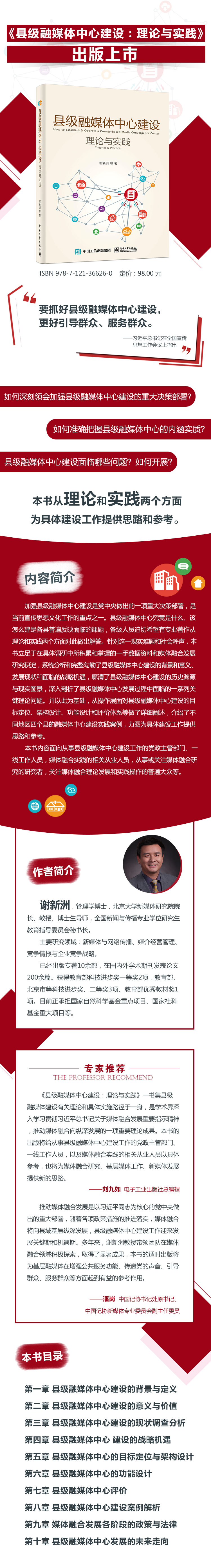 加强县级融媒体中心建设是党中央做出的一项重大决策部署,是当前宣传思想文化工作的重点之一。县级融媒体中心究竟是什么、该怎么建是各县普遍反映面临的难题,各级人员迫切希望有专业著作从理论和实践两个方面对此做出解答。针对这一现实难题和社会呼声,本书立足于在具体调研中所积累和掌握的一手数据资料和媒体融合发展研究积淀,系统分析和完整勾勒了县级融媒体中心建设的背景和意义、发展现状和面临的战略机遇,廓清了县级融媒体中心建设的历史渊源与现实图景,深入剖析了县级融媒体中心发展过程中面临的一系列关键理论问题。并以此为基础,从操作层面对县级融媒体中心建设的目标定位、架构设计、功能设计和评价体系等做了详细阐述,介绍了不同地区四个县的融媒体中心建设实践案例,力图为具体建设工作提供思路和参考。 本书内容面向从事县级融媒体中心建设工作的党政主管部门、一线工作人员,媒体融合实践的相关从业人员,从事或关注媒体融合研究的研究者,关注媒体融合理论发展和实践操作的普通大众等。