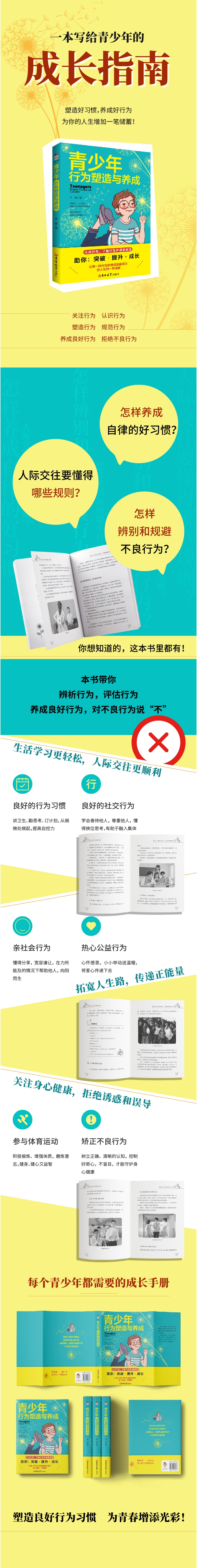 青少年思维活跃,想象 力丰富,自我意识与好奇心 强,而正是因为这样,心理 尚未成熟、辨识能力较弱的 青少年也容易形成一些不良 行为。 本书带你增知识、广见 闻,带你认识行为、了解行 为;教你如何辨别行为,评 估自己的行为;帮你规避不 良行为,养成良好行为,让 你的成长之路充满阳光。