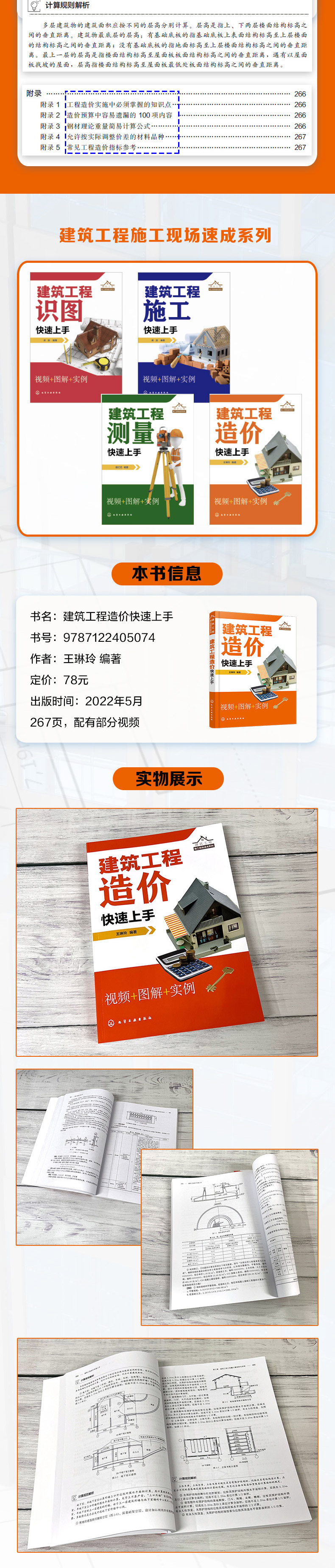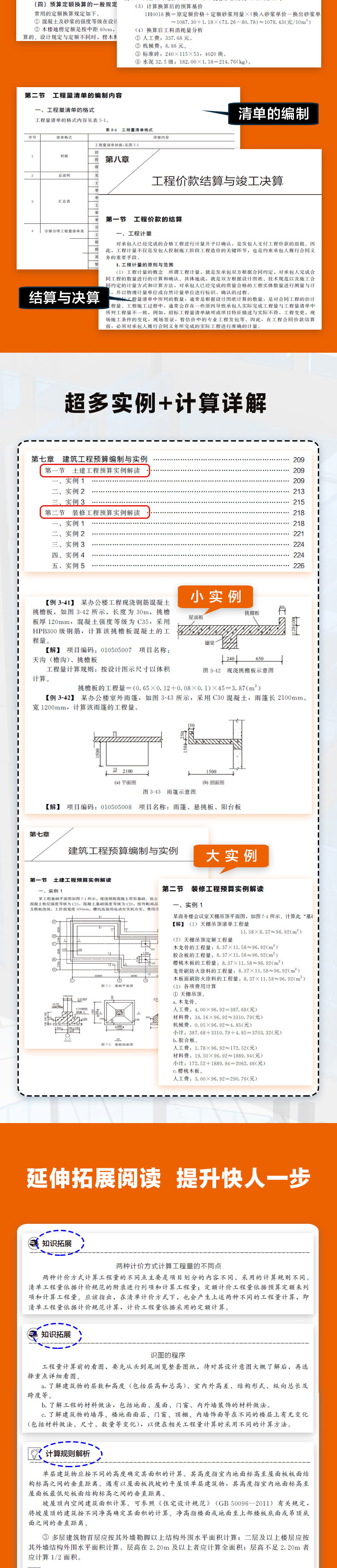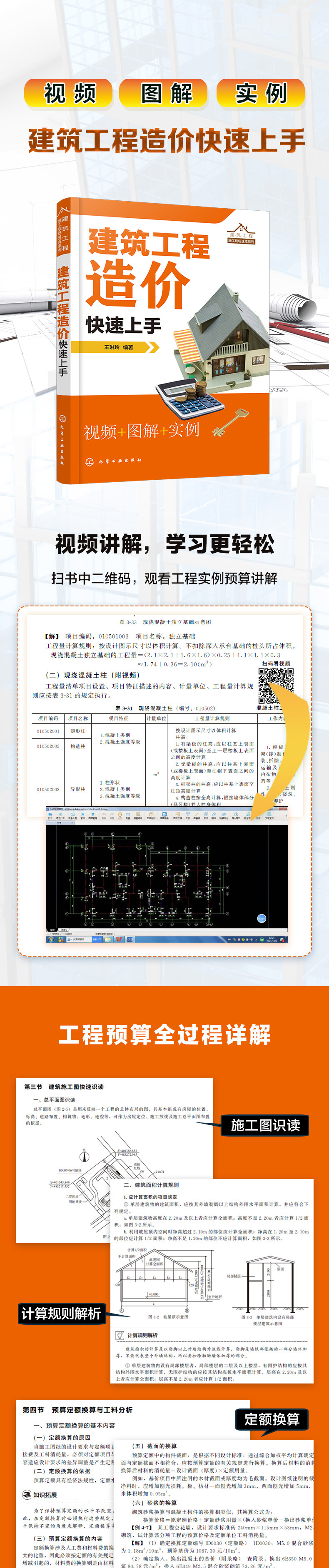 第一章 建筑工程造价基础知识 001 第一节 建筑工程造价简述 001 一、工程造价基本分类 001 二、工程造价的构成 001 第二节 工程造价常见名词释义 012 第三节 建筑工程定额计价 012 一、建筑工程定额初识 012 二、建筑工程预算定额手册的基本应用 015 第四节 建筑工程工程量清单计价 016 一、工程量清单初识 016 二、工程量清单计价 017 第五节 工程量清单计价与预算定额计价的联系和区别 018 一、工程量清单计价与预算定额计价的联系 018 二、工程量清单计价与预算定额计价的区别 020 第二章 快速识读施工图 023 第一节 施工图预算 023 第二节 施工图的组成 023 一、初识建筑施工图 023 二、建筑施工图基本要素 025 三、施工图识读流程 026 第三节 建筑施工图快速识读 027 一、总平面图识读 027 二、建筑平面图识读 029 三、建筑立面图识读 031 四、建筑剖面图识读 032 五、建筑详图识读 034 第四节 结构施工图快速识读 035 一、初识结构施工图 035 二、基础图识读 041 三、结构平面图识读 042 四、结构详图识读 044 第五节 建筑水暖电施工图快速识读 045 第三章 建筑工程工程量计算规则与实例 046 第一节 建筑工程工程量计算基础知识 046 一、工程量的含义 046 二、工程量计算的依据、原则和顺序 046 三、工程量计算的方法 047 四、分部分项工程项目划分 048 第二节 建筑面积的计算 051 一、建筑面积的含义 051 二、建筑面积计算规则 052 三、建筑面积计算实例 059 第三节 土石方工程工程量的计算 062 一、土石方工程计算规则(附视频) 062 二、土石方计算规则详解(附视频) 066 第四节 地基处理与边坡支护工程工程量的计算 073 第五节 桩基工程工程量的计算 078 一、桩基工程工程量计算规则 078 二、桩基工程工程量计算规则详解(附视频) 082 第六节 砌筑工程工程量的计算 085 一、砌筑工程工程量计算规则(附视频) 085 二、砌筑工程计算规则详解 093 第七节 混凝土及钢筋混凝土工程工程量的计算 097 一、混凝土及钢筋混凝土工程量计算规则 097 二、混凝土及钢筋混凝土工程量计算规则详解 117 第八节 金属结构工程工程量的计算 123 一、钢架工程的计算规则 123 二、钢柱、梁、板工程的计算规则 125 三、钢构件及金属制品工程的计算规则 129 第九节 屋面防水工程工程量的计算 132 一、瓦、型材及其他屋面工程的计算规则 132 二、屋面防水及其他工程的计算规则(附视频) 133 三、墙面防水、防潮工程的计算规则 135 四、楼(地) 面防水、防潮工程的计算规则 136 第十节 装饰装修工程工程量的计算 137 一、楼地面装饰工程的计算规则(附视频) 137 二、墙、柱面装饰与隔断、幕墙工程的计算规则(附视频) 143 三、天棚工程的计算规则 151 第十一节 措施项目工程量的计算 154 一、措施项目工程量计算规则 154 二、措施项目工程量计算规则详解 159 第十二节 工程量速算方法 161 第十三节 工程量复核方法 161 第四章 预算定额的应用 162 第一节 建筑工程基础定额 162 一、建筑工程基础定额手册的组成内容 162 二、基础定额的应用特点 163 第二节 预算定额 164 一、预算定额的概念 164 二、预算定额的作用 164 三、预算定额的内容及使用 165 第三节 概算定额 166 一、概算定额的概念 166 二、概算定额的作用 167 三、概算定额的内容 167 四、概算定额手册的组成和应用 168 第四节 预算定额换算与工料分析 169 一、预算定额换算的基本内容 169 二、预算定额换算方法与工料分析 169 第五节 材料价差调整 174 第五章 工程量清单计价 176 第一节 工程量清单的概念及应用 176 一、工程量清单的概念 176 二、工程量清单的应用 176 第二节 工程量清单的编制内容 177 一、工程量清单的格式 177 二、工程量清单的编制 191 第三节 工程量清单计价规范的主要内容 193 第四节 工程量清单计价的费用构成与计算 195 一、工程量清单计价的费用构成 195 二、工程量清单计价的费用计算 195 第六章 建筑工程招投标 201 第一节 建筑工程项目招标概述 201 一、招投标的概念 201 二、工程招标投标程序 201 三、招标投标的基本原则 202 四、招标投标的基本方式 202 第二节 工程造价在招投标中的重要地位 203 一、工程造价在招投标中的作用 203 二、招投标阶段的工程造价控制 204 第三节 建筑工程投标策略 205 一、工程量清单报价前期准备 205 二、工程量清单报价常用策略 206 第七章 建筑工程预算编制与实例 209 第一节 土建工程预算实例解读 209 一、实例1 209 二、实例2 213 三、实例3 215 第二节 装修工程预算实例解读 218 一、实例1 218 二、实例2 221 三、实例3 224 四、实例4 224 五、实例5 226 第八章 工程价款结算与竣工决算 230 第一节 工程价款的结算 230 一、工程计量 230 二、预付款及期中支付 231 三、竣工结算 233 四、最终结清 236 第二节 工程竣工决算 237 一、建设项目竣工决算的概念及作用 237 二、竣工决算的内容和编制 238 第三节 建筑工程竣工结算审核 248 第九章 影响工程造价的因素 249 第一节 工程质量与造价 249 第二节 工程工期与造价 250 第三节 工程索赔与造价 252 第四节 营改增对工程造价的影响 253 第十章 工程签证 254 第一节 工程签证的分类 254 一、工程签证的概念 254 二、工程签证的一般分类 254 第二节 各种形式变更、签证、索赔之间的关系 257 一、相互关系 257 二、洽商 258 三、技术核定单 2