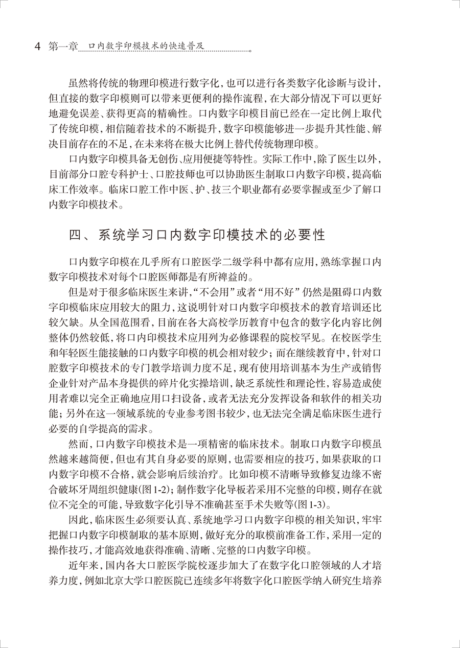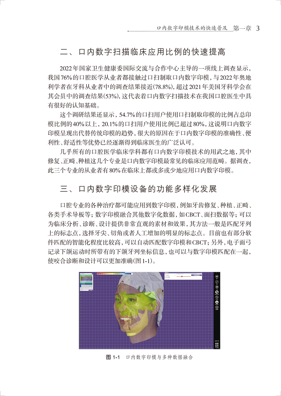 第一章 口内数字印模技术的快速普及 / 1 一、 口内数字印模技术的发展和设备产业化进展 / 2 二、 口内数字扫描临床应用比例的快速提高 / 3 三、 口内数字印模设备的功能多样化发展 / 3 四、 系统学习口内数字印模技术的必要性 / 4 第二章 口内数字印模技术的基本认识 / 7 一、 口内数字印模技术的基本原理 / 8 二、 口内数字印模技术的优势 / 10 三、 口内数字印模设备的辅助功能 / 15 第三章 口内数字印模技术的准确度及影响因素/ 21 一、 局部牙列口内数字印模的准确度 / 22 二、 全牙列口内数字印模的准确度 / 26 三、 种植冠桥修复口内数字印模的准确度 / 27 四、 全口种植桥架修复口内数字印模的准确度 / 29 五、 牙槽嵴黏膜口内数字印模的准确度 / 30 第四章 口内数字印模技术临床操作流程及技巧/ 33 一、 口内数字印模制取前的设备准备 / 34 二、 口内数字印模制取前的临床准备 / 38 三、 常规口内数字印模的制取过程 / 43 四、 口内数字印模的检查 / 52 五、 口内数字印模的储存与发送 / 56 第五章 口内数字印模在固定修复和种植修复中的要求和技巧 / 59 一、 BOPT过渡修复体和永久修复体穿龈形态的口内数字印模 / 60 二、 个性化桩核修复的口内数字印模 / 63 三、 固定桥修复的口内数字印模 / 64 四、 常规种植修复的口内数字印模 / 65 五、 美学区种植过渡修复体的口内数字印模 / 70 六、 复制美学区种植过渡修复体穿龈轮廓的口内数字印模 / 73 七、 种植固定桥的口内数字印模 / 79 八、 全口种植固定修复的口内数字印模 / 81 第六章 口内数字印模在口腔医学其他领域的应用 / 83 一、 从数字化微笑设计到四维虚拟病人 / 84 二、 数字化引导手术 / 91 三、 数字化正畸 / 97 四、 牙周夹板式粘接桥 / 101 五、 可摘局部义齿和全口义齿修复 / 102 六、 科研价值 / 103 第七章 口内数字印模技术的局限性与发展趋势/ 105 一、 口内数字印模技术的局限性 / 106 二、 口内数字印模技术的发展趋势 / 108 参考文献 / 111