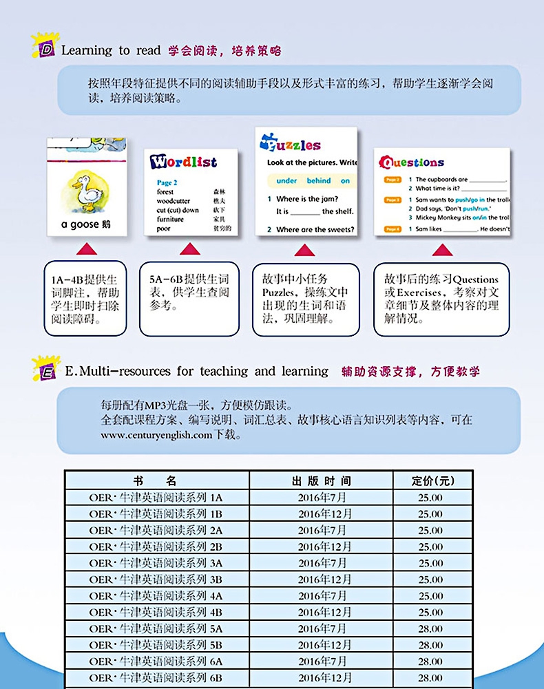 本套丛书是全新升级的新版分级阅读丛书,是为了适应新课标的要求,使学生更好地学习牛津英语教材,提高学生的英语阅读能力,而从牛津大学出版社引进的一套英语阅读丛书。本丛书不仅语言地道,题材广泛,而且难易程度适中,可与牛津英语教材同步使用。每册书都配有大量的练习,能帮助学生在提升阅读理解能力的同时,拓展英语学习视野。本丛书每学期配一册,一共12册,每册都配有MP3光盘,供学生听读模仿使用。