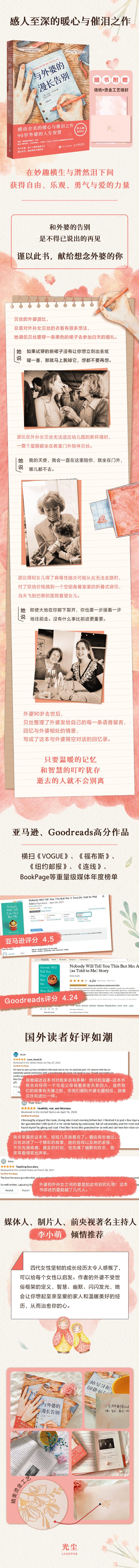 《外婆的道歉信》同款外婆,感人至深的暖心与催泪之作,只要温暖的回忆和智慧的叮咛犹存,逝去的人就不会别离!随书附赠精美信封+信纸;谨以此书,献给想念外婆的你。