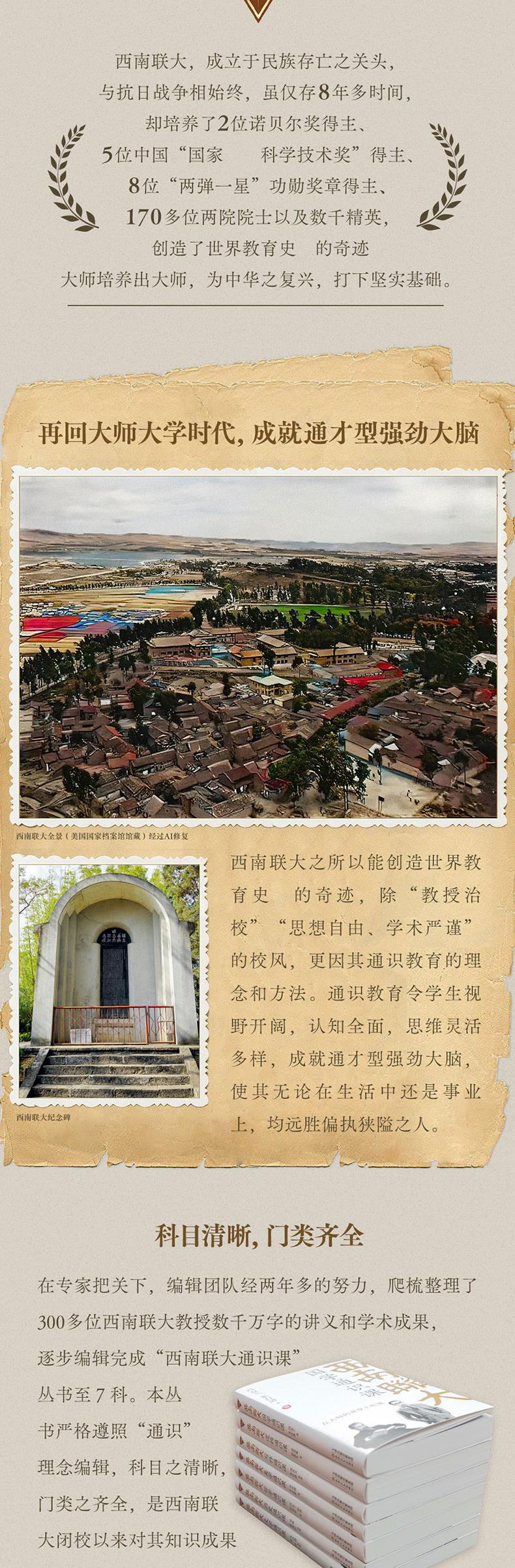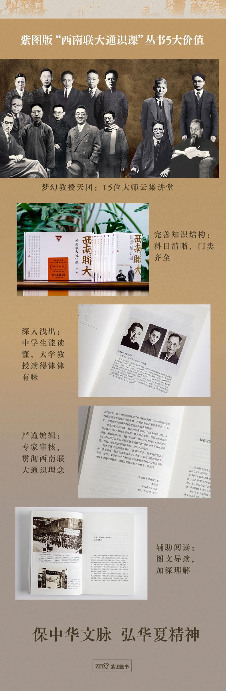 编辑推荐 ★西南联大通识课(全7册):礼盒套装——15位大师讲授7大必修通识课 ★7册即7科,科目清晰,体系完备 ★专家审核,严格贯彻西南联大通识理念编辑整理 ★大师大学时代教育成果,中西激荡辉煌思想成就 ★完善您的知识结构,成就通才型强劲大脑 ★讲台上是大师,讲台下是未来的大师 北大、清华、南开三校合一的西南联大,成立于民族存亡之关头,与抗日战争相始终。虽仅存8年多时间,却培养出2位诺贝尔奖得主、5位中国“国家优选科学技术奖”得主、8位“两弹一星”功勋奖章得主、170多位两院院士以及数千精英,创造了世界教育目前的奇迹。大师培养出大师,为中华之复兴,打下坚实基础。 ★再回大师大学时代,成就通才型强劲大脑 西南联大之所以能创造世界教育目前的奇迹,除“教授治校”“思想自由、学术严谨”的校风,更因其通识教育的理念和方法。通识教育令学生视野开阔,认知全面,思维灵活多样,成就通才型强劲大脑,使其无论在生活中还是在事业上,均远胜偏执狭隘之人。 ★专家审核,严格贯彻西南联大通识理念编辑整理,7册即7科,科目清晰,体系完备 在专家把关下,编辑团队经2年多的努力,爬梳整理了300多位西南联大教授数千万字的讲义和学术成果,逐步编辑完成“西南联大通识课”丛书至7科。本丛书科目之清晰,门类之齐全,是西南联大闭校以来对其教育成果严格而大规模的一次整理。 ★中国教育天花板之成果,15位大师主讲,7门必修通识课 《西南联大文学通识课》:朱自清、闻一多、浦江清、胡适、陈寅恪讲授 《西南联大历史通识课》:吴晗、雷海宗、张荫麟、傅斯年、胡适讲授 《西南联大哲学通识课》:冯友兰、胡适、汤用彤讲授 《西南联大美学通识课》:朱光潜、朱自清讲授 《西南联大写作通识课》:沈从文、朱自清、朱光潜讲授 《西南联大国学通识课》:冯友兰、朱自清讲授 《西南联大逻辑通识课》:金岳霖、殷海光讲授 15位大师各呈所长,互文成趣,多层次启发读者,再现西南联大教授“竞争”授课原貌。 ★礼盒套装超值附赠:西南联大主题帆布包、精美藏书票、笔记本,梅贻琦名言书签 ★珍贵老照片+AI技术处理,联大历史风貌犹在眼前 ★烫金+起凸工艺,触摸历史中的璀璨年华