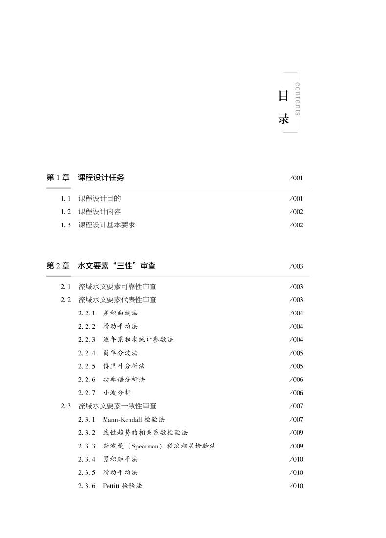 本教材按照高校水利学科专业规范核心课程教材的建设要求编写。全书共6章。第一章 课程设计任务;第二章 水文要素“三性”审查;第三章 水文频率分析,包括流域水文频率分析方法和设计实例;第四章 设计洪水分析实验,包括由洪水推求设计洪水、由暴雨推求设计洪水和设计实例;第五章 水库防洪调度实验,包括水库防洪调度计算的目的、水库防洪调度计算原理和设计实例;第六章 水库兴利调度实验。