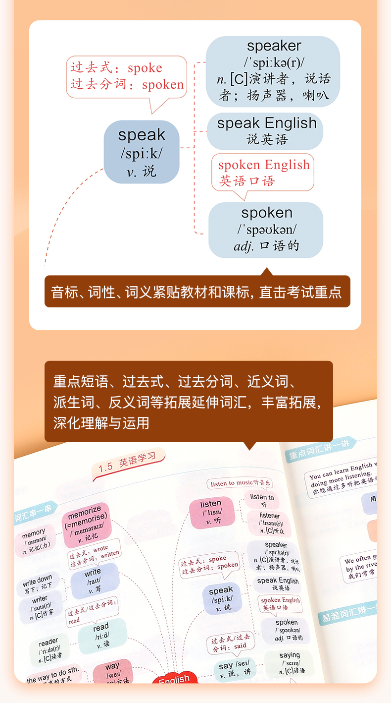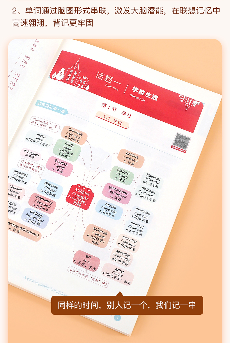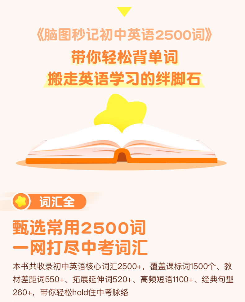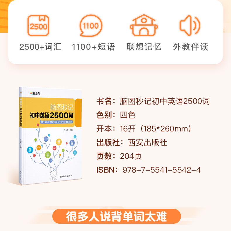 《脑图秒记初中英语2500词》由作业帮英语教研团队收集整理12个词汇话题并深度研究,结合学生熟悉60个日常生活场景,通过词汇场景联想记忆法,帮助学生在熟悉场景中积累单词,不难懂,不陌生,更牢固,更轻松。本书共收录初中英语核心词汇2500+,覆盖课标词1500个、教材差距词550+、拓展延伸词520+、高频短语1100+、经典句型260+,带学生轻松hold住中考脉络。每个主题场景配有重点单词讲解&易混词汇辨析&话题句型拓展等实用讲解,解决小学阶段英语单词的记背练用等全部问题。各版本教材通用,配有外教音频伴读,带你轻松背单词,搬走英语学习的绊脚石!