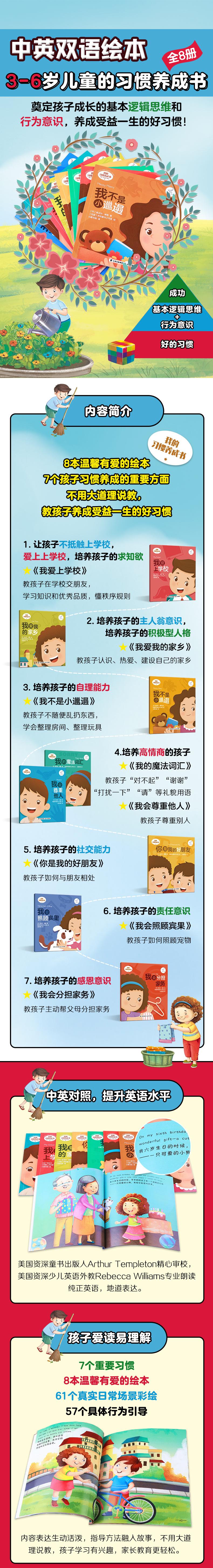 1.《我的习惯养成书》较为系统全面,涵盖帮父母分担家务、简单自理、学习敬语、讲礼貌、爱上学等方方面面,且通俗易懂,是家长为3-6岁宝宝挑选“习惯养成”类启蒙绘本的不二之选。 2.好的习惯能让孩子拥有良好的思维逻辑和行为意识,为孩子的成功奠定基石,让孩子受益一生。 3.从国外引进,中英对照,培养孩子好习惯的同时,让孩子在学习第二语言的很好时期接受英语启蒙。 4. 8个重要习惯+61个真实日常场景彩绘+57个具体行为引导+8个读后巩固小练习/小游戏+8个“35天好习惯养成表”,助力孩子一步步扎扎实实地将好行为变成好习惯。 5.亲子共读,增进感情,温馨有爱。