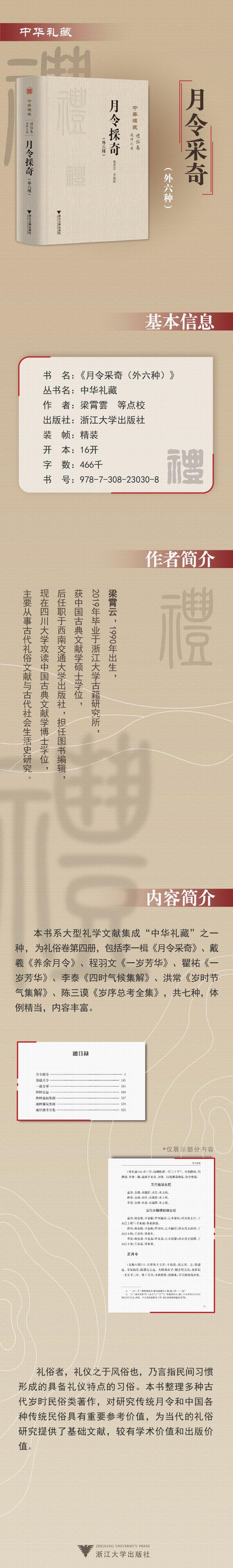 本书为《中华礼藏·礼俗卷》第四册,包括李一楫《月令采奇》、戴羲《养余月令》、程羽文《一岁芳华》、瞿祐《一岁芳华》、李泰《四时气候集解》、洪常《岁时节气集解》、陈三谟《岁序总考全集》,共七种,体例精当,内容丰富。礼俗者,礼仪之于风俗也,乃言指民间习惯形成的具备礼仪特点的习俗。本书整理多种古代岁时民俗类著作,对研究传统月令和中国各种传统民俗具有重要参考价值,为当代的礼俗研究提供了基础文献,较有学术价值和出版价值。