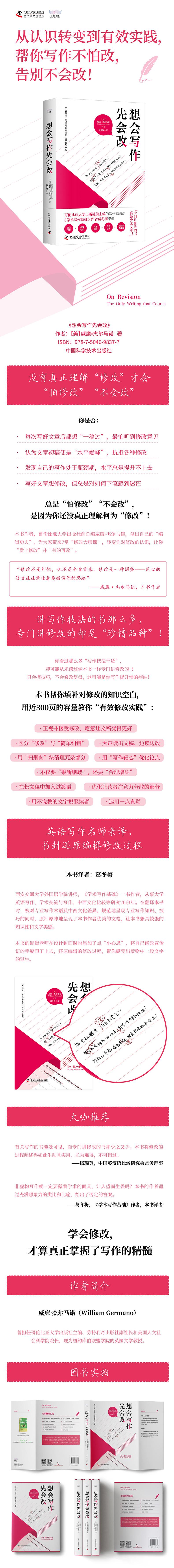 推荐理由1:“怕改”“无处可改”是因为对修改的认识不够准确。哥伦比亚大学出版社前总编帮读者重新系统地认识、练习修改,最终“爱上修改”。推荐理由2:本书是写作书中专讲修改的“珍惜品种”,近300页全面解读“有效修改认识+实践”。推荐理由3:英语写作名师亲译,规范呈现学术知识的同时原汁原味体现作者文字美感。