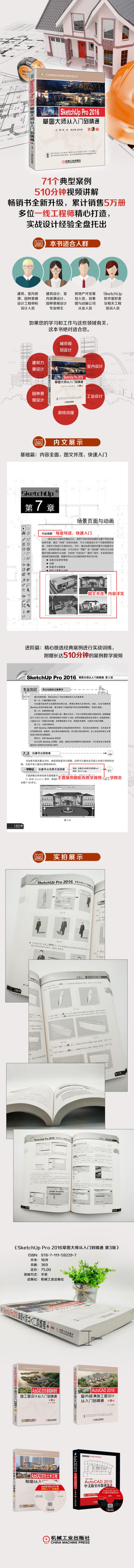 《SketchUp Pro 2016草图大师从入门到精通 第3版》主要讲解SketchUp Pro 2016的使用。全书共分15章,第1~12章讲解了SketchUp Pro 2016软件基础,包括初识SketchUp、SketchUp Pro 2016 的操作界面、图形的绘制与编辑、图层的运用及管理、材质与贴图、群组与组件、页面与动画、截面工具、沙盒工具、插件的利用、文件的导入与导出、V-Ray渲染器;第13~15章,以室内模型、别墅小区、景观模型等案例进行实战训练,并对其后的PS图像的处理进行全程讲解。 《SketchUp Pro 2016草图大师从入门到精通 第3版》结构合理,实例丰富,图文并茂,版块分明,适合广大室内设计、建筑设计、景观设计工作人员与相关专业的大中专院校学生阅读,也可供房地产开发策划人员、效果图与动画公司的从业人员以及SketchUp爱好者参考。另外,附赠的网盘资源包含全书实例的素材和源文件,以及主要实例的教学视频。