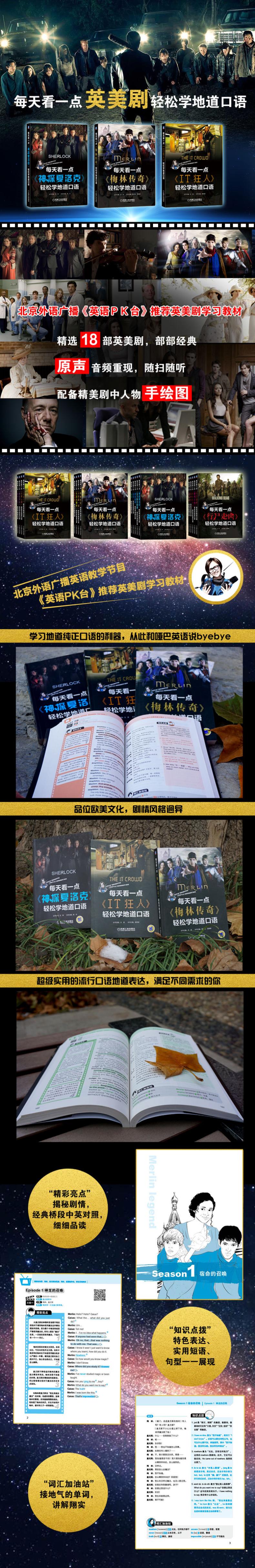北京外语广播英语教学节目《英语PK台》推荐英美剧学习教材。看美剧学英语练口语已经成为当下年轻人热烈追捧的一种学习方式,美剧的情节精彩,引人入胜,所含的口语语料丰富,接地气的短语、单词、句型讲解翔实,是学习地道纯正口语的一手资料,足不出国就可以零距离学习地道口语,让同学们张的开口,说的自信。本套丛书包含18部受欢迎的经典英美剧,部部经典,口语类型多样,同学们可以根据自己的喜好选择学习,同时全书配备原声音频资料,扫二维码即可轻松聆,方便学习,省时省力。深入分析剧情及欧美文化背景,帮助同学们厘清脉络和人物关系,从而更加容易理解长难句意思。精选经典对白,中英对照,帮助考生记录接地气的口语常用句子。本书非常适合英语口语学习者、即将出国学习、生活的人员以及想了解欧美文化的读者。