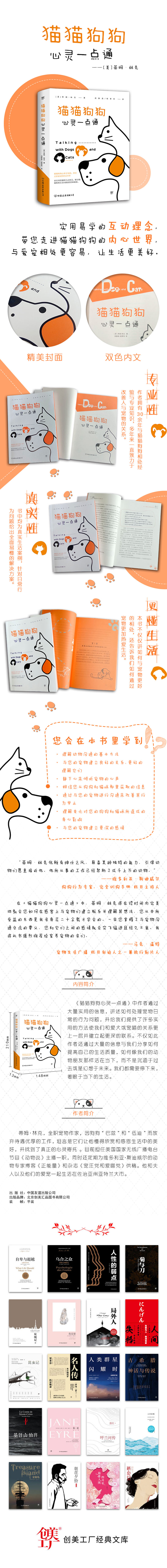 《猫猫狗狗心灵一点通》中作者通过大量实用的信息,讲述如何处理宠物日常的行为问题,并给我们提供了许多实用的方法使我们和爱犬或宠喵的关系更上一层并建立起更深的联系。不仅如此作者还通过大量的信息与我们分享如何提高自己的生活质量,如何像我们的动物朋友那样活在当下,而不是沉湎于过去或是幻想于未来。我们都需要停下来,着眼于当下的生活。