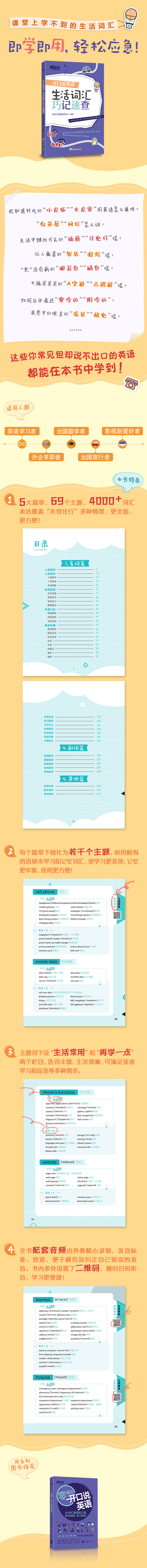1. 系统实用将收录词汇按照名词、动词、形容词、副词及其他划分为5大篇章,每个篇章下又细化为若干个主题,利用相似的语境来学习和记忆词汇,使学习更系统、记忆更牢靠、查阅更方便!2. 全面细致主题词下设“生活常用”和“再学一点”两个栏目,选词丰富,主次清晰,可满足读者学习和应急等多种需求。3. 地道发音全书配套音频由外教精心录制,发音标准、地道,便于模仿及纠正自己错误的发音。书内多处设置了二维码,随时扫码听音,学习更便捷!