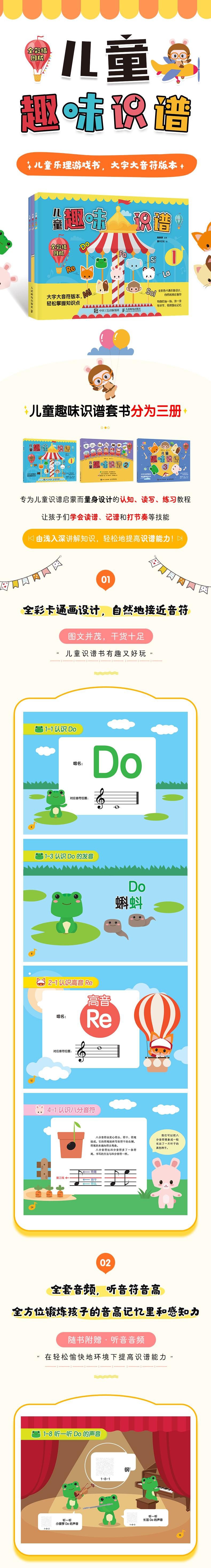 作为一本尊重孩子学习规律的识谱教材,从孩子易接受的角度出发,打破集中学习某个知识点的模式,由浅入深地把相近的知识点分开学习,避免让孩子一次被动接受太多的知识,让孩子在不知不觉中,轻松愉快地提高识谱能力,枯燥的识谱过程会变成一件既简单又快乐的事。 1.全彩卡通画设计,自然地接近音符 2.全套听音音频,听音符音高,多方位锻炼孩子的音高记忆力和感知力 3.有趣的写写画画涂涂练习环节,动动手,增强记忆 4.大字大音符版本,轻松读懂讲解文字,轻松get知识要点