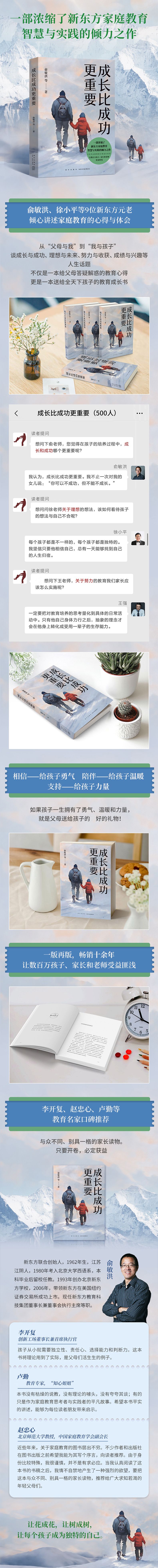 《成长比成功更重要》是一部浓缩了新东方家庭教育智慧与实践的倾力之作,收录了俞敏洪、徐小平等9位新东方高管的教育心得。从“父母与我”到“我与孩子”,讲述人与读者朋友一起开展了一场心与心的对谈,聊聊成绩与兴趣、读书与做人,分享接受家庭教育的经历和个人成长的轨迹,以及他们对自己子女实施家庭教育的理念与具体操作经验……