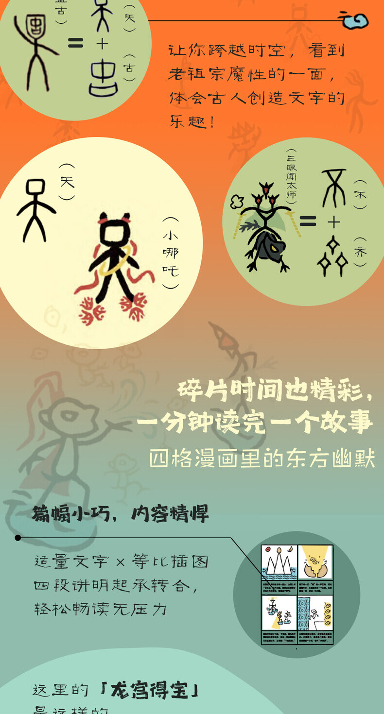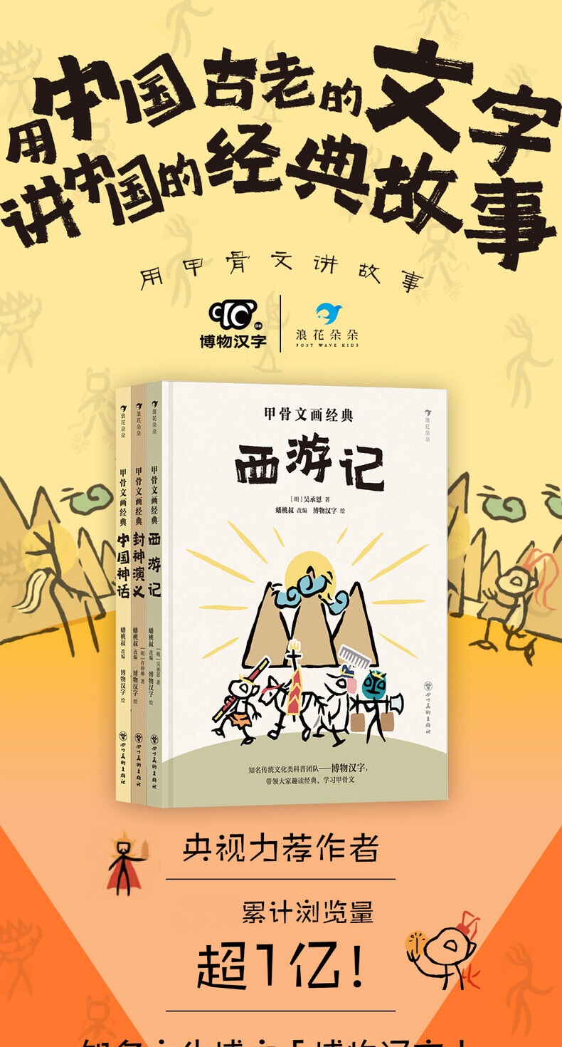甲骨文画经典系列,是一套用中国古文字甲骨文绘制中国经典故事的图书。该系列第一辑共3册,分别为《西游记》《封神演义》《中国神话》。每册根据原著改编成32-35个故事。每个故事由四格漫画呈现,画面中的人物和背景元素都是利用甲骨文绘制,生动、可爱、传神,让3000多年的中国古文字复活过来,穿越时空,和读者展开对话,为孩子们提供了一个全新而有趣的视角阅读经典,亲近传统文化。