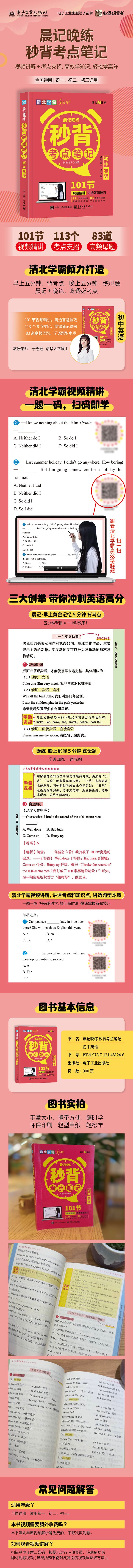 本书对初中英语的知识点进行了整体梳理,在 去除冗余信息后,提炼出核心知识点,帮助学生快 速掌握考点。书中设计了“晨记:重难点解析”版 块,对重要知识点、易混易错点等进行深入解析, 帮助学生理解并掌握;并配备了“晚练:典型例题 和视频讲解”版块,帮助学生掌握解题技巧。在“ 学霸支招”版块,为学生提供有效的学习方法指导 ,帮助学生提高学习效率。同时,本书还对教材上 的部分知识点进行了拓展延伸,满足学有余力的学 生进一步学习的需求。