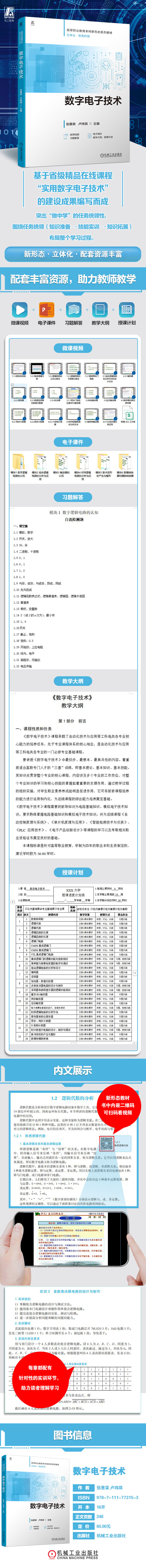 本书是基于省级精品在线课程“实用数字电子技术”的建设成果而精心编写的。本书由数字逻辑电路的认知、组合逻辑电路的分析与应用、触发器的认知、时序逻辑电路的分析与应用、脉冲波形的产生与整形、数/模和模/数转换器、半导体存储器和可编程逻辑器件、综合实训8个模块组成。前7个为学习模块,最后1个为综合实训。前6个学习模块均由三部分组成,即知识准备、技能实训和知识拓展,且每个学习模块都配有自我检测题、思考题与习题。实训部分要求学生按规范工艺要求装配相应的电路,调试并排查故障。通过对本书的学习,学生既能掌握理论知识,又能具备较强的动手能力,真正做到理论联系实际。 本书适用于职业本科院校、普通本科院校、高职高专院校(根据课时情况,可做适当取舍)电子与信息大类和自动化类专业的“数字电子技术”“电子电路基础”等课程的教学,符合目前职业教育“项目导向、任务驱动”的课改方向。此外,本书也可作为技术培训教材,还可供相关工程技术人员和业余爱好者参考。