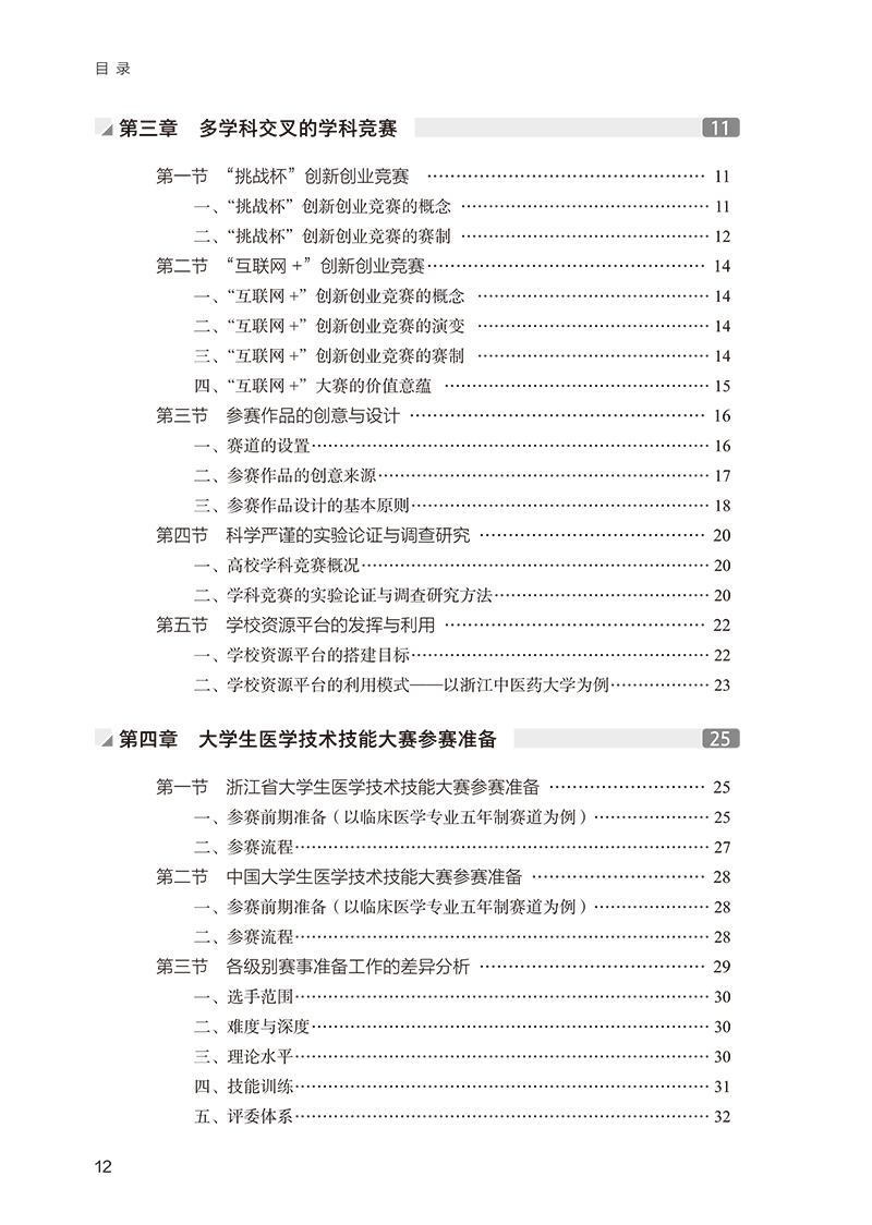 本教材的出版将不断深化医学院校学科竞赛体系建设,通过“为什么参赛”、“能参加什么竞赛”“如何进行竞赛准备”等问题,引导本科学生强化多种能力尤其是科研创新能力的培养。通过各类专业类和综合类学科竞赛参赛学生和指导老师的实战案例,模拟学科竞赛参赛全过程,并利用学校各学科竞赛基地组织的校级学科竞赛为平台,开展实践训练。医学生通过不同类别的学科竞赛提升专业知识以外的其他学科交叉能力,对推进新医科发展具有重要的意义。