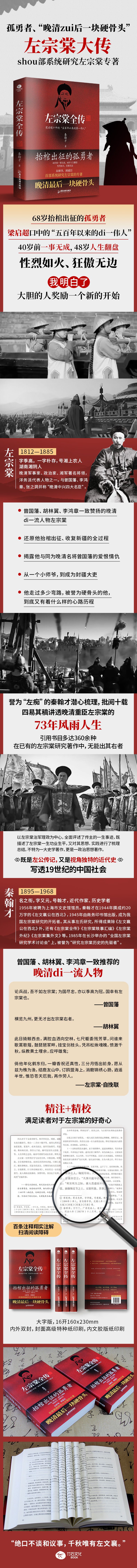 《左宗棠全传》是近代 作家、历史学者秦翰才的代 表作。作者前前后后写了十 几年,四易其稿,是首部系 统研究左宗棠的专著。其内 容翔实缜密,语言简练,作 者参考了大量历史资料和前 人著作,引用书目360种, 一一铺开。在已有的左宗棠 研究著作中,无能出其右者 。文学艺术评论家郑逸梅先 生在《艺林散叶》中如此描 述:“秦翰才早有左癖,后 有谱癖。所谓左癖者,搜集 左宗棠史料。所谓谱癖者, 搜集古今各家年谱。” 本书以左宗棠治军理政 为中心,全面评述了传主的 一生事迹,既描述了左宗棠 一生功业生平,又对其思想 、实践进行了梳理总结,不 特为一大史学著作,更是一 政治思想著作。