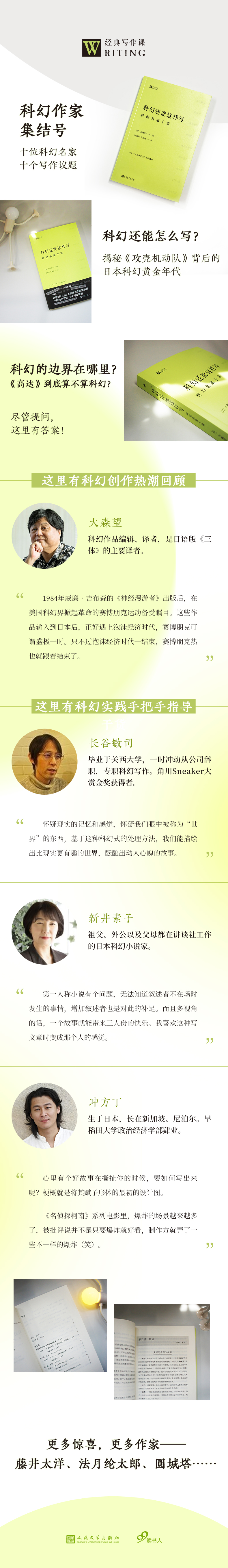 大森望在科幻领域深耕四十余年,是编选、评论、翻译科幻作品的全能选手。这一次,借GENRON科幻写作坊的机会,大森望邀请到长谷敏司、冲方丁、法月纶太郎、新井素子、圆城塔等九位知名科幻作家,独辟蹊径,打破科幻写作的思维定式,希望激发出新一代科幻作者的创造潜能。