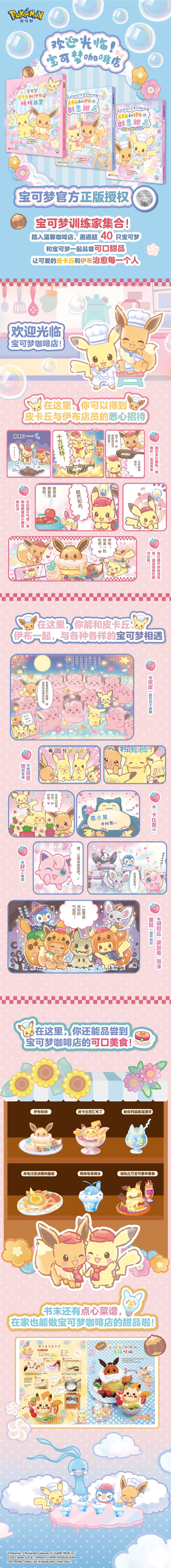 这是一套专为宝可梦训练家精心打造的温馨治愈的绘本系列。全套共3本,分别为《皮卡丘和伊布的暖暖日常》《皮卡丘和伊布的创意甜品》《皮卡丘和伊布的创意甜品.热热闹闹来烹饪》。其中,《皮卡丘和伊布的暖暖日常》细腻描绘了皮卡丘与伊布在日常生活里展开的趣味冒险。《皮卡丘和伊布的创意甜品》及《皮卡丘和伊布的创意甜品.热热闹闹来烹饪》讲述的是皮卡丘和伊布在聚集着宝可梦的咖啡店里愉快工作的故事。每本书由11~13个短篇故事组成,不管是初涉宝可梦世界的小朋友,还是资深的宝可梦训练家,都能在书中尽情领略宝可梦们的可爱之处,获得心灵治愈。