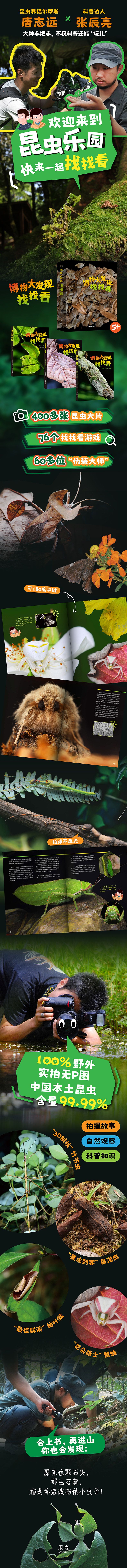 这是昆虫摄影师唐志远 和科普作家张辰亮继《博物 大发现:我的1000位昆虫 朋友》后的再度联手,主打 一个“就是玩儿”——让读者 通过超微距镜头感受自然的 神奇与震撼,沉浸式探索奇 妙的昆虫世界,尽情挑战眼 力,看看谁能成为“找虫高 手”!书中的超高清大片呈 现了隐藏在我们视线之外的 奇妙自然,配以作者真实有 趣的拍摄经历、细腻的自然 观察记录和大白话科普知识 点,好玩又好笑。更奇特的 是,经验和知识也都在找虫 的同时完成了自动吸收。跟 紧博物天团“老唐X小亮”的 脚步,读者既能直击拍摄现 场,体验有趣、惊险又艰辛 的拍摄过程,又能看到第一 手的自然观察记录,亲历生 命的非凡成长瞬间。一颗石 头、一截树枝、一丛苔藓, 都别有洞天。一起来玩“找 找看”!