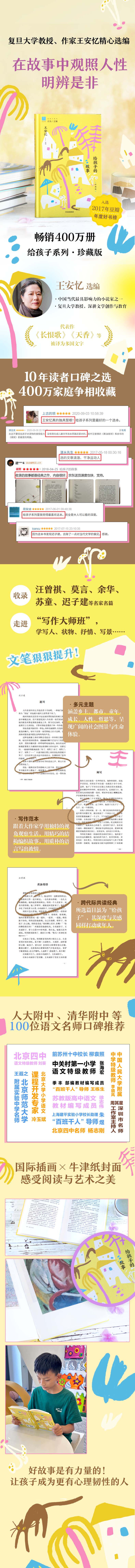 《给孩子的故事》由作家王安忆编选,在中国当代作家作品中,遴选出27篇经典,其中以短篇小说为主,也有数篇散文。在编选过程中,王安忆跳脱出“儿童文学”的概念,在所有的故事写作中,挑选出适合孩子阅读的篇目。《给孩子的故事》中收入的“故事”以小说为主,但王安忆的编选标准并非从文体出发,而在于给孩子一个有头有尾的文本,其中有几篇散文,也是有人和事,有发展和结局,称之“散文”是因为来自真实的经验,不是虚构,是非虚构,但并不违反叙事完整的原则。这是编者出于一种让孩子的阅读“回到人类的童年时代,漫长的冬夜,围着火炉听故事”的经验期待。