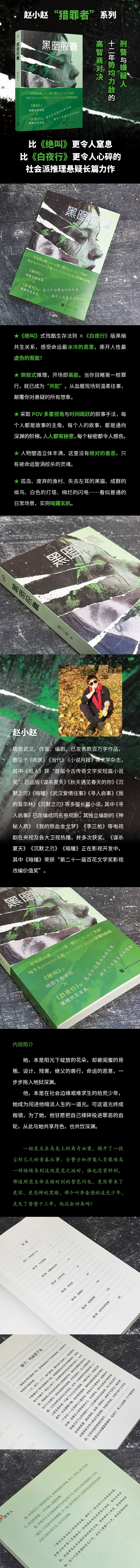 赵小赵 现居武汉,作家、编剧。已发表数百万字作品,散见于《收获》《当代》《小说月报》等文学杂志,其中《纸人》获“首届今古传奇文学奖短篇小说奖”。已出版《谋杀夏天》《秋天遇见春天的你》《沉默之刃》《暗瞳》《武汉爱情往事》《寻人启事》《我的昙华林》《沉默之刃》等多部长篇小说。其中《寻人启事》已改编成同名电视剧,其独立编剧的《神秘人质》《我的铁血金戈梦》《李三枪》等电视剧在央视及各大卫视热播,并多次获奖。《谋杀夏天》《沉默之刃》《暗瞳》正在影视化制作中。