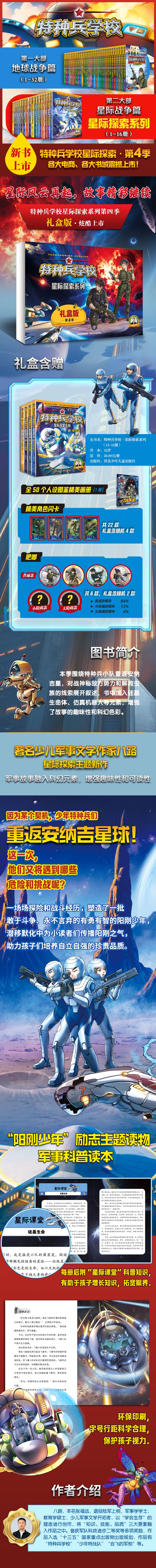 “特种兵学校星际探索系列”第四季包括《黑甲武士》《异星浩劫》《正义联盟》《虫族崛起》4种,是著名少儿军事文学作家八路的系列作品。 本季围绕特种兵小队登陆安纳吉星,对战神秘敌方势力和解救虫族的线索展开。同时,书中加入硅基生命体、仿真机器人等元素,增强了故事的趣味性和科幻色彩。