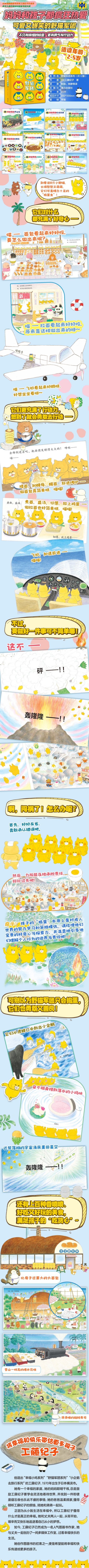 \\\"“野猫军团系列”是日本畅销图画书作家工藤纪子的代表作,多次荣获日本MOE绘本屋奖。幽默可爱,适合2-5岁孩子阅读。 书中上百种香喷喷的各色美食,好玩又爆笑的“捣蛋”大作战,以及“贱贱”又萌萌的捣蛋小野猫形象,迷倒了众多孩子与家长。 一群调皮捣蛋的小野猫,偷偷溜进汪汪先生面包店、小火车、寿司店……它们想和汪汪先生一样烤面包、开火车、做旋转寿司……可没想到却闯下一大堆让人好笑又好气的祸:面包房被面包撑爆了、火车被爆米花炸膛了、寿司店被大水冲毁了、做咖喱被老虎大王抓走当小弟、做团子被小偷偷走…… 闯祸的野猫军团该怎么办呢? “野猫军团系列”共12册 《野猫军团烤面包》 这是汪汪先生的面包房,野猫军团正偷偷地往里面看。面包真香、真好吃,野猫军团也好想吃。他们悄悄溜进面包房,想要自己做一个大大的面包。可是,面包做得太大了!轰——整座面包房都被面包撑起来了! 野猫军团该怎么办呢? 《野猫军团开火车》 这是汪汪先生的火车,野猫军团正偷偷地看着它。火车真帅、真好玩,野猫军团也好想坐一坐。他们悄悄溜上火车,轰隆轰隆开动了火车。火车上装了好多玉米,野猫军团肚子饿了,来烤爆米花吧!可是,爆米花烤太多,轰——火车机炉被撑起来了! 野猫军团该怎么办呢? 《野猫军团吃寿司》 这是汪汪先生的寿司店,野猫军团正偷偷地往里面看。寿司真香、真好吃,野猫军团也好想吃。他们悄悄地将寿司店的寿司转盘接在了竹滑梯上,然后在寿司店前挖起洞来,想偷偷地躲在洞里吃竹滑梯滑下来的寿司。可是,轰——他们不小心挖爆了水管,寿司店被大水冲毁了! 野猫军团该怎么办呢? 《野猫军团开飞机》 这是汪汪先生的飞机场,野猫军团正偷偷地往里面看。飞机真帅、真好玩,野猫军团也好想坐一坐。他们悄悄爬上飞机,轰隆飞上了天。可是飞机没有加油,野猫军团迫降在了无人岛。不过他们一点也不担心,在树上搭好树屋,每天快乐地抓鱼、吃香蕉…… 一年过去,野猫军团想家了,他们怎样才能离开无人岛呢? 《野猫军团冰淇淋王国》 这是汪汪先生的冰淇淋店,野猫军团正偷偷地往里面看。冰淇淋真香、真好吃,野猫军团也好想吃。他们悄悄溜进冰淇淋生产车间,啊呜啊呜吃光了全部冰淇淋。这时,刮起了暴风雪,刚刚走出车间的野猫军团全都被冻僵了…… 野猫军团该怎么办呢? 《野猫军团吃蛋糕》 这是汪汪先生的蛋糕店,野猫军团正偷偷地往里面看。刚烤好的蛋糕真香、真好吃,野猫军团也好想吃。他们刚想靠近一点,没想着踩到了会魔法的蚂蚁,被蚂蚁变得好小好小! 野猫军团该怎么办呢? 《野猫军团吃团子》 这是汪汪先生的米粉团子店,野猫军团正偷偷地往里面看。米粉团子真软、真好吃,野猫军团也好想吃。他们悄悄溜进米粉团子店,做了好多好多米粉团子,可没想到,一阵奇怪的龙卷风把团子全卷走了,还弄坏了米粉团子店! 野猫军团能追回团子吗? 《野猫军团吃咖喱饭》 这是汪汪先生的咖喱店,野猫军团正偷偷地往里面看。咖喱饭真香、真好吃,野猫军团也好想吃。他们悄悄溜进咖喱店,咕嘟咕嘟煮起咖喱来。咖喱煮得太香了,老虎大王跑下山,吃光了咖喱,还抓走了野猫军团! 野猫军团该怎么办呢? 《野猫军团出海去》 喵,出海旅行看上去好好玩,好想去玩啊! 野猫军团这回盯上了汪汪先生的大船“汪汪号”,他们偷偷溜上船,出海去啦! 可谁能想到,他们居然遇上了一群神秘的访客!而为了帮助这群神秘的访客,野猫军团竟然拆了“汪汪号”的关键部件! “汪汪号”会怎么样呢?这群神秘的访客最终能得救吗? 《野猫军团吃拉面》 喵,拉面看起来好好吃,好想吃啊! 野猫军团这回盯上了汪汪先生的拉面店,他们趁汪汪先生外出去摆摊,偷偷溜进店里做拉面! 可谁能想到,他们居然遇上了一群饥饿的村民进来要饭吃, 甚至还有凶恶的怪兽来捣乱! 野猫军团会帮助饥饿的村民们吗? 他们又会如何与怪兽对抗呢? 《野猫军团去露营》 喵,露营地的早餐看起来好好吃,肚子好饿啊! 野猫军团这回盯上了汪汪先生丰盛的露营地早餐,他们趁汪汪先生去买蜂蜜,偷偷溜进露营地,啊呜啊呜吃光了早餐。 突然,他们听见了小玛咪的求救声。原来,小玛咪不小心掉进河里了! 野猫军团“扑通扑通”跳进河里,想去营救小玛咪,没想到自己也被急流冲走了! 野猫军团能够脱险吗?他们最后成功救出小玛咪了吗? 《野猫军团烤比萨》: 喵,比萨看起来好好吃,好想吃啊! 野猫军团这回盯上了汪汪先生的比萨面店,他们趁汪汪先生出去送外卖,偷偷溜进店里做比萨! 喵!和面、放料、送进烤炉,一切so easy! 可谁能想到,烤炉突然砰的一声炸飞了! 这下可糟了,野猫军团要如何收拾残局,才能让大家吃上美味的披萨呢?\\\"