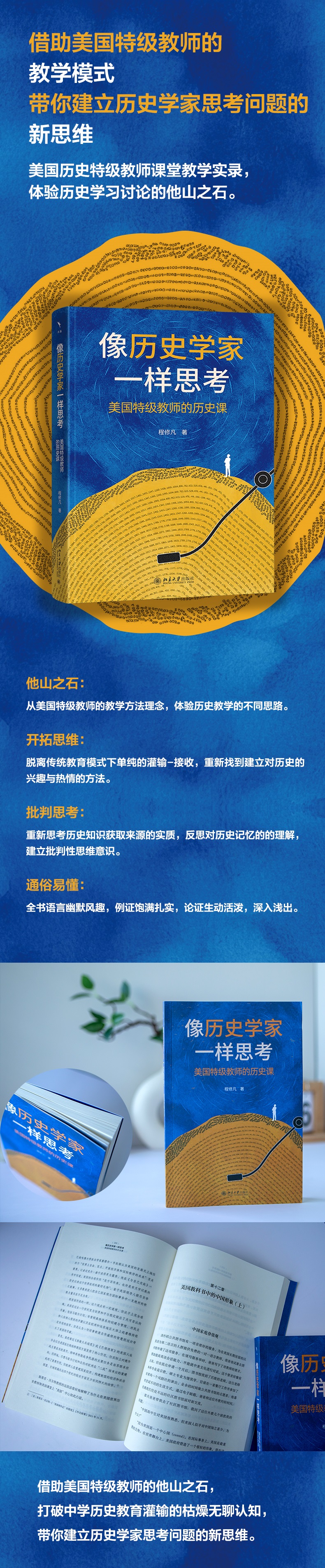 推荐序一 学会像历史学家一样思考 .................................................................1 推荐序二 批判性思维之旅 ....................................................................................5 上篇 议题讨论型课堂 第一章 历史课的开场白:午餐打架事件 ................................................... 003 第二章 启蒙运动与美国立国 .......................................................................... 008 一、一张家庭作业纸 / 009 二、一堂让我目瞪口呆的讨论课 / 012 三、来不及做笔记的“一言堂” / 014 四、理性或罪性——哪个是美国政府的奠基? / 017 五、我的探索:美国真的是基督教立国吗? / 023 第三章 “犹太人大屠杀”:一份完整的教案.............................................. 032 一、“快速阅读”与“地理技能” / 032 二、他者与仇恨金字塔 / 034 三、勒尚邦的勇气 / 038 四、bystander 和 upstander:复杂的道德和公民问题 / 045 五、中学生排斥案 / 057 第四章 冷战时期的拉美:美国是主动干涉还是被动卷入? ............... 063 一、危地马拉 / 064 二、古巴 / 068 三、智利 / 073 四、拉美的课堂项目 / 076 第五章 像历史学家一样阅读 .......................................................................... 078 一、阅读一手文献 / 079 二、考察两种教科书的不同记载 / 083 三、解读不同立场的文献 / 085 四、进入历史的语境中阅读 / 091 五、一堂专门的文献评估课 / 097 第六章 读图读历史 ............................................................................................ 101 一、图片侦查:“透过艺术看历史”和“图解历史” / 101 二、解读政治卡通:“画廊行走活动” / 108 三、运用地理技能 / 112 四、运用视觉资料探索历史议题 / 115 第七章 通过历史课训练批判性思维 ............................................................ 118 一、概念的力量 / 118 二、批判性思维和十七项历史技能 / 125 三、讨论历史议题模块训练的主要技能 / 131 第八章 1968 年:全球视野............................................................................. 138 一、音乐中的 1960 年代 / 139 二、《休伦港宣言》 / 143 三、1968 年的四个抗议 / 146 四、如何评价 1968 年? / 150 下篇 历史项目研究 第九章 历史项目:探索性学习...................................................................... 157 一、章节项目 / 158 二、期末考试项目 / 160 三、“历史学家小组”展示项目:个人项目和团队合作项目 / 162 第十章 人物研究:为什么曼德拉被广泛纪念?...................................... 166 一、美国教材中的曼德拉 / 167 二、为什么是曼德拉而不是德克勒克? / 170 三、曼德拉象征了什么? / 172 四、为什么曼德拉成为美国英雄? / 180 第十一章 自选项目:“二战”中被忽略的中国 ........................................ 184 一、美国历史教科书中没有南京大屠杀 / 185 二、三方文献考察南京大屠杀 / 187 三、“二战”中被忽略的中国 / 189 四、我的探索:美国教科书为何忽略中国在“二战”中的地位? / 195 五、被夸大的美国 / 198 第十二章 美国教科书中的中国形象(上) ............................................... 201 一、古代中国:孔子和家庭价值观 / 203 二、中国的文化变迁 / 208 第十三章 美国教科书中的中国形象(中) ............................................... 216 一、美国教科书中的“清王朝衰亡” / 217 二、英雄与“他者”:美国教科书的叙述角度 / 223 三、我的探索:美国真的是关心中国生死存亡的英雄吗? / 226 四、我的探索:门户开放政策来得早些就能阻止义和团运动吗? / 232 第十四章 美国教科书中的中国形象(下) ............................................... 236 一、美国教科书中的辛亥革命 / 236 二、我的探索:为何美国教科书说辛亥无革命? / 240 三、美国教科书中的孙中山形象 / 247 后 记 ........................................................................................................................ 254 附 录 技能培养手册 ........................................................................................ 256