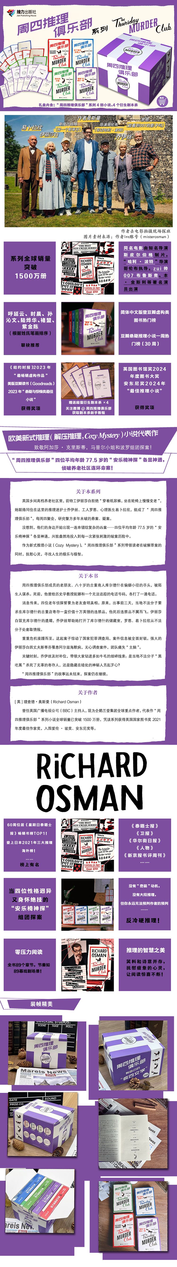 \\\"【英】理查德?奥斯曼(Richard Osman) 前英国广播电视公司(BBC)主持人,现为企鹅兰登集团全球重点作者,代表作“周四推理俱乐部”系列小说全球销量已突破1500万册,凭该系列获得英国图书奖(British Book Awards)2021年度最佳作家奖,入围爱伦·坡、安东尼奖等。 他的文字风格成熟、幽默,把尖锐的机锋隐藏在一句句捧腹大笑的叙述里;尤其擅长人物描写,“周四推理俱乐部”系列作品中的四位平均年龄77.5岁的老人,每个人都个性鲜明,让人印象深刻。\\\"