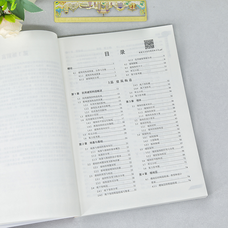 绪论 0.1 建筑的构成要素、分类与分级 0.1.1 建筑的构成要素 0.1.2 建筑物的分类 0.1.3 民用建筑等级分类 0.2 建筑模数 0.3 建筑构件尺寸 0.4 单元小结 0.5 复习思考题 上篇 建筑构造 第1章 民用建筑构造概述 1.1 民用建筑的构造组成 1.2 影响建筑构造的因素 1.2.1 外界环境的影响 1.2.2 建筑技术条件的影响 1.2.3 经济条件的影响 1.3 建筑设计原则 1.4 民用建筑定位轴线 1.4.1 墙体的平面定位轴线 1.4.2 框架结构的定位轴线 1.4.3 建筑的竖向定位 1.5 单元小结 1.6 复习思考题 第2章 地基与基础 2.1 地基与基础的基本知识 2.1.1 地基与基础的基本概念 2.1.2 地基的分类 2.1.3 地基与基础的设计要求 2.2 基础的埋置深度及影响因素 2.2.1 基础的埋置深度 2.2.2 影响基础埋深的因素 2.3 基础的类型与构造 2.3.1 按材料及受力特点分类 2.3.2 按构造形式分类 2.4 地下室构造 2.4.1 地下室的分类 2.4.2 地下室的构造组成与要求 2.4.3 地下室防潮 2.4.4 地下室防水 2.5 单元小结 2.6 复习思考题 第3章 墙体 3.1 墙体的基本知识 3.1.1 墙体的作用 3.1.2 墙体的类型 3.1.3 墙体的承重方案 3.2 墙体的设计要求 3.3 墙体的构造 3.3.1 墙体材料 3.3.2 墙体的细部构造