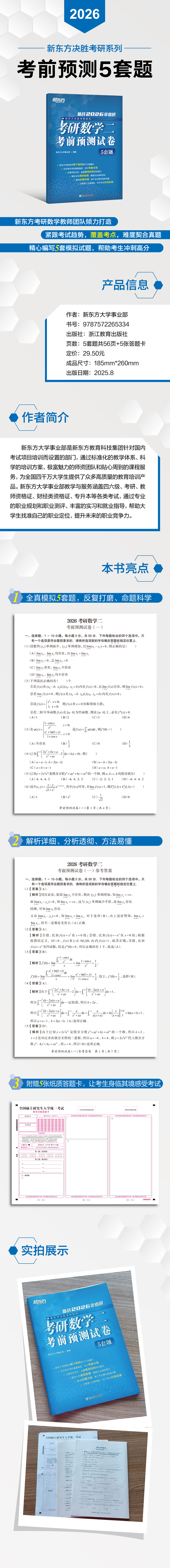 本书是新东方大学事业部编著的考研数学二预测试卷,旨在帮助考生提前熟悉考试题型和考试难度,巩固所学知识,强化训练,掌握解题方法。本书共包含5套试卷,每套试卷都是新东方考研教师在分析考试大纲和近几年考研真题后,几经打磨编写而成的。难度契合真题,出题精准独到,知识考查全面,解答分析透彻,方法清晰明了,解析步骤详细,质量精优,是陪伴考生考研路上的不错选择。