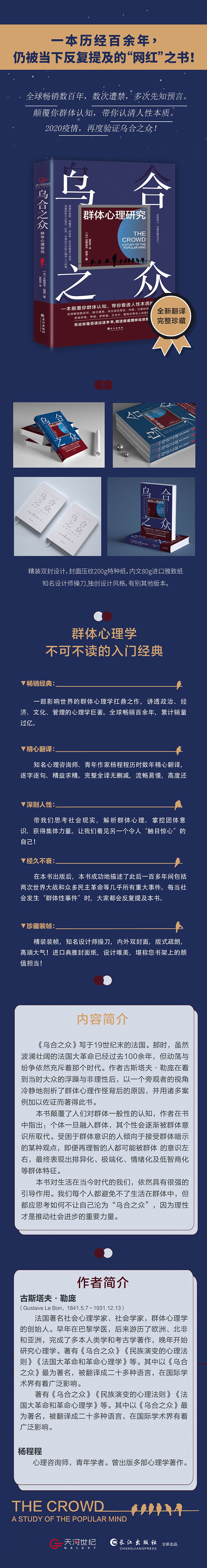 古斯塔夫·勒庞(Gustave Le Bon,1841.5.7-1931.12.13),法国著名社会心理学家、社会学家,群体心理学的创始人。早年在巴黎学医,后来游历了欧洲、北非和亚洲,完成了多本人类学和考古学著作,晚年开始研究心理学。著有《乌合之众》《民族演变的心理法则》《法国大革命和革命心理学》等。其中以《乌合之众》最为著名,被翻译成二十多种语言,在国际学术界有着广泛影响。 译者简介: 杨程程,心理咨询师,青年学者。曾出版多部心理学著作。