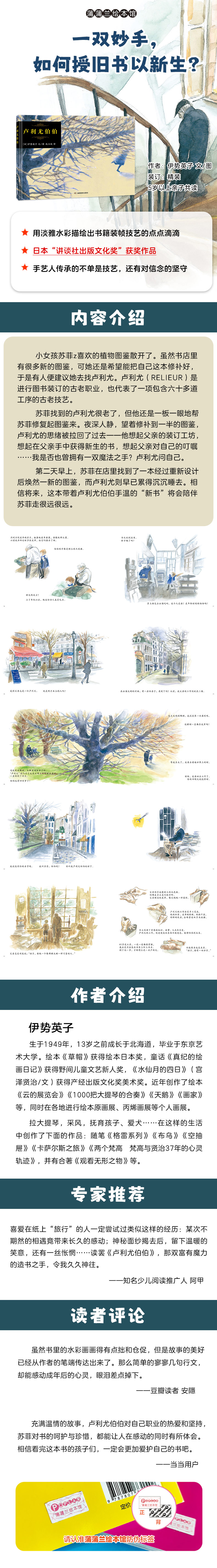 小女孩苏菲最喜欢的植物图鉴散开了。虽然书店里有很多新的图鉴,可她还是希望能把自己这本修补好,于是有人便建议她去找卢利尤。卢利尤(RELIEUR)是进行图书装订的古老职业,也代表了一项包含六十多道工序的古老技艺。 苏菲找到的卢利尤很老了,但他还是一板一眼地帮苏菲修复起图鉴来。夜深人静,望着修补到一半的图鉴,卢利尤的思绪被拉回了过去——他想起父亲的装订工坊,想起在父亲手中获得新生的书,想起父亲对自己的叮嘱……我是否也曾拥有一双魔法之手?卢利尤问自己。 第二天早上,苏菲在店里找到了一本经过重新设计后焕然一新的图鉴,而卢利尤则早已累得沉沉睡去。相信将来,这本带着卢利尤伯伯手温的“新书”将会陪伴苏菲走很远很远。