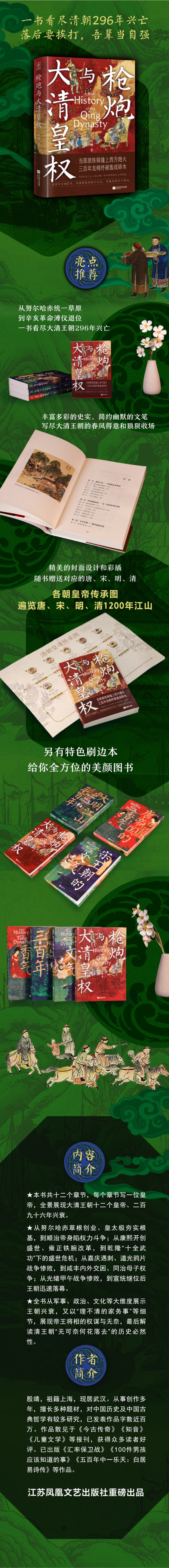 本书共十二个章节,每个章节写一位皇帝,全景展现大清王朝十二个皇帝、二百六十八年兴衰。从努尔哈赤草根创业、皇太极奠定基业,到顺治帝身陷权斗;从康熙开创盛世、雍正铁腕改革,到乾隆“十全武功”下的盛世危机;从嘉庆遇刺、道光鸦片战争惨败,到咸丰内外交困、同治母子权争;从光绪甲午战争惨败,到宣统继位后王朝迅速落幕。全书从军事、政治、文化等大维度揭示了王朝兴衰规律,又以“理不清的家务事”等细节,展现帝王将相的权谋与无奈,最后解读清王朝“无可奈何花落去”的历史必然性。