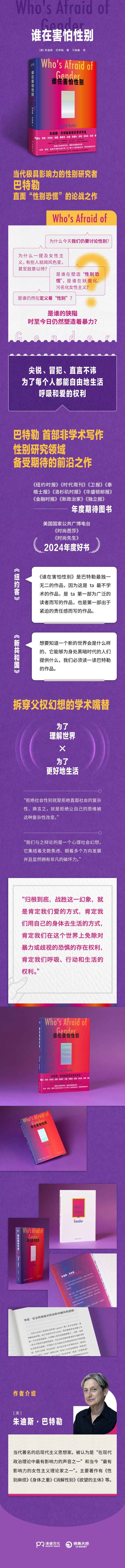 作为当今世界最重要的女性主义思想家之一,巴特勒一直以颠覆性的哲学观点和迂回曲折的理论分析著称,对于波伏娃、伊利格瑞和赛吉维克的理论如数家珍,黑格尔、弗洛伊德和福柯的引文更是随处可见。一般读者对巴特勒的了解,恐怕只有“生理性别和社会性别一样是被建构的”这句口号。但是,面对近年来性别恐慌全球化的现象,巴特勒出版了首部面向大众、更为通俗易懂的作品。在巴特勒看来,如今社会上盛行的性别恐慌是一种人为建构的幻象,目的是“剥夺少数人的基本权利”。而《谁在害怕性别》要做的就是揭穿这些谎言和幻象,引导人们重新审视我们对性别和性别平等的理解,创造一个可自由行动、呼吸、相爱的世界。