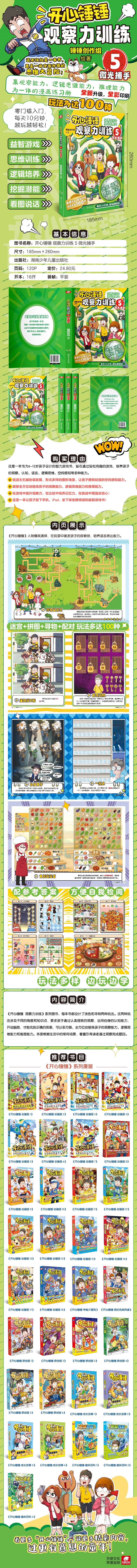 本册内容和画面全面升级,不仅将小朋友们喜爱的《开心锤锤》动画角色融入其中,还添加了各种各样的玩法,不再局限于涂色和找物件,这一册的思维脑力训练更强,更加能够锻炼孩子的观察力。作为低年级孩子专属的知识启蒙读物,它别具匠心。孩子们在阅读时,想象力与记忆力悄然提升,面对问题也能学会主动思考、解决。阅读这本书,就像开启一场奇妙旅行,让孩子在欢乐中收获知识,实现成长与蜕变。