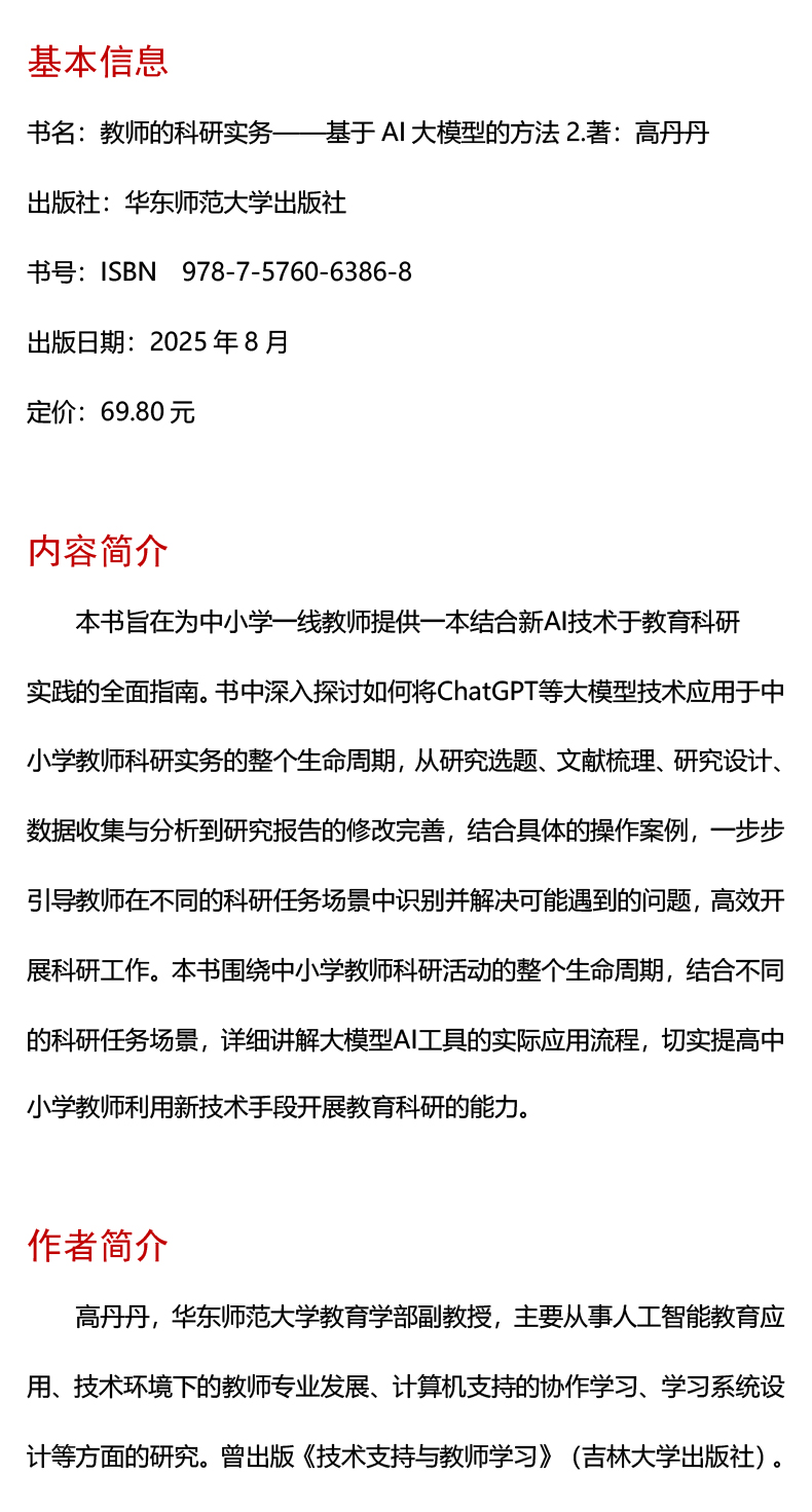 本书旨在为中小学一线教师提供一本结合最新AI技术于教育科研实践的全面指南。书中深入探讨如何将ChatGPT等大模型技术应用于中小学教师科研实务的整个生命周期,从研究选题、文献梳理、研究设计、数据收集与分析到研究报告的修改完善,结合具体的操作案例,一步步引导教师在不同的科研任务场景中识别并解决可能遇到的问题,高效开展科研工作。本书围绕中小学教师科研活动的整个生命周期,结合不同的科研任务场景,详细讲解大模型AI工具的实际应用流程,切实提高中小学教师利用新技术手段开展教育科研的能力。