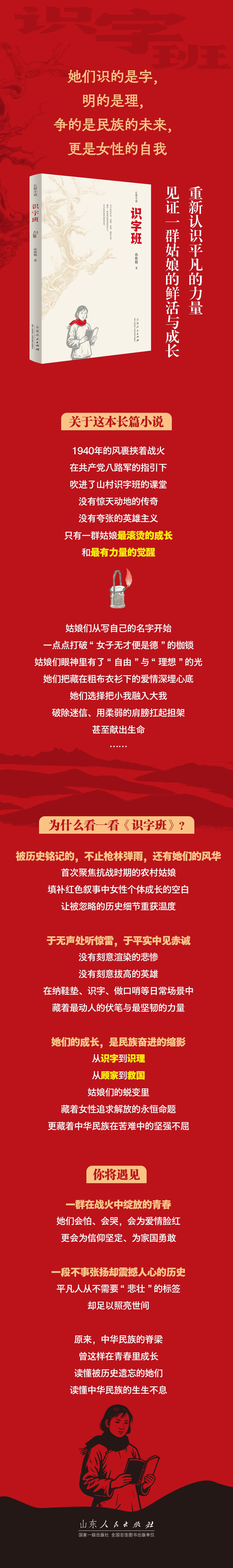 以1940-1945年抗战时期沂蒙山区的一个村庄为舞台,将目光投向一群鲜少被文学与历史浓墨重彩书写的群体——村庄里的姑娘们。?在那个烽火连天的动荡年代,共产党八路军为她们推开了一扇通往新世界的门。她们走进识字班的课堂,从写下第一个名字开始,笨拙却坚定地打破陈腐教条。在识字班,她们不仅学习文化知识,更逐渐萌生对自由与光明的渴望。? 小说以平实克制的语言,串联起姑娘们的成长轨迹:有冲破家庭阻挠时的倔强,有面对爱情时的羞涩与挣扎,更有在国仇家恨面前的毅然抉择……看似不动声色的叙述中,暗藏着多处巧妙伏笔,引领读者在字里行间触摸到她们思想觉醒的温度,感受那份交织着青春悸动与无私牺牲的滚烫灵魂。? 这群普通姑娘的故事,不仅是个人挣脱束缚、追求解放的成长,更折射出中华民族在苦难中挺直的坚韧脊梁,让那段被忽略的历史细节,在文学的笔触下重焕动人光彩。