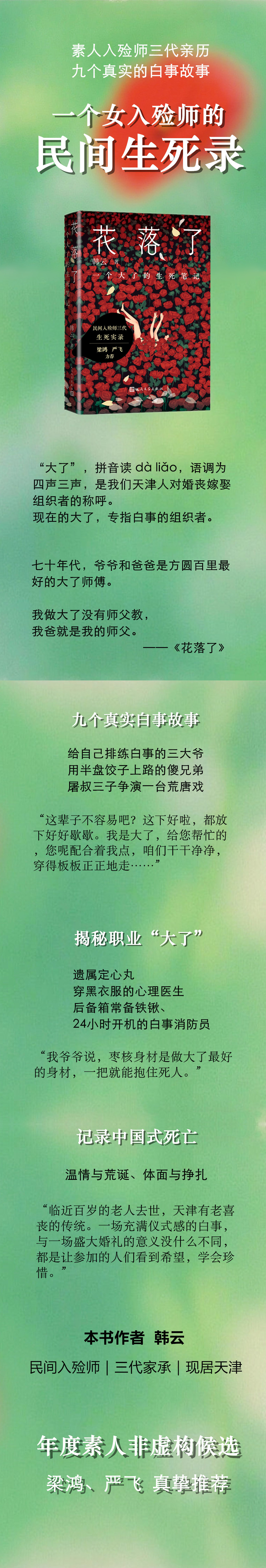 这是一部真实书写民间殡葬故事、探讨生死哲学的行业纪实文学,也是一部充满感情的素人非虚构。作者韩云祖辈三代从事大了。大了,即天津地区对民间入殓师的称呼。 作者以亲身经历为蓝本,将殡葬故事、家族群像与生死哲思巧妙融合,描绘了丧葬文化背后的人情世态。 人世间的聚散无常与坚韧重生,既展现了东方文化中“向死而生”的辩证思维,也传递出对生命尊严的尊重……