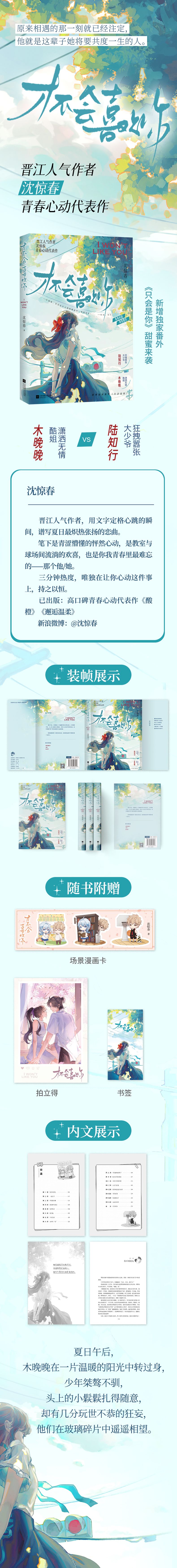 沈惊春 晋江人气作者,用文字定格心跳的瞬间,谱写夏日最炽热张扬的恋曲。 笔下是青涩懵懂的怦然心动,是教室与球场间流淌的欢喜,也是你我青春里最难忘的——那个他/她。 三分钟热度,唯独在让你心动这件事上,持之以恒。 已出版:高口碑青春心动代表作《酸橙》《邂逅温柔》 狂拽嚣张神颜大少爷 vs 潇洒无情学霸酷姐——《只会是你》甜蜜来袭 新浪微博:@沈惊春
