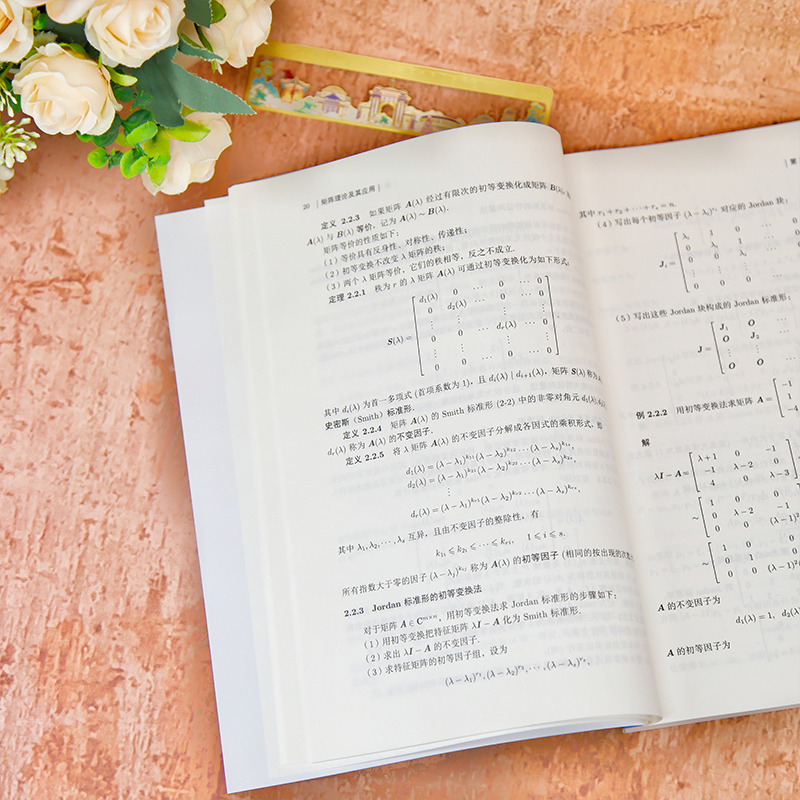 本书介绍矩阵理论及其 应用。全书共11章,包括: 矩阵理论基础,矩阵的标准 形,线性空间,内积与范数 ,线性变换,矩阵分解,矩 阵分析,矩阵的广义逆,矩 阵的Kronecker积与 Hadamard积,特殊矩阵, 张量分析。各章均配有习题 ,书末有习题答案或提示。 与传统的矩阵理论教材相比 ,本书更强调矩阵理论的应 用,增加了案例分析和 Python相关的命令与函数介 绍,使读者能在较短时间内 掌握矩阵理论基本知识及其 应用。 本书可作为理工农医类 硕士研究生和工程硕士研究 生的教材,也可供理工农医 类高年级本科生、工程技术 及研究人员参考使用。