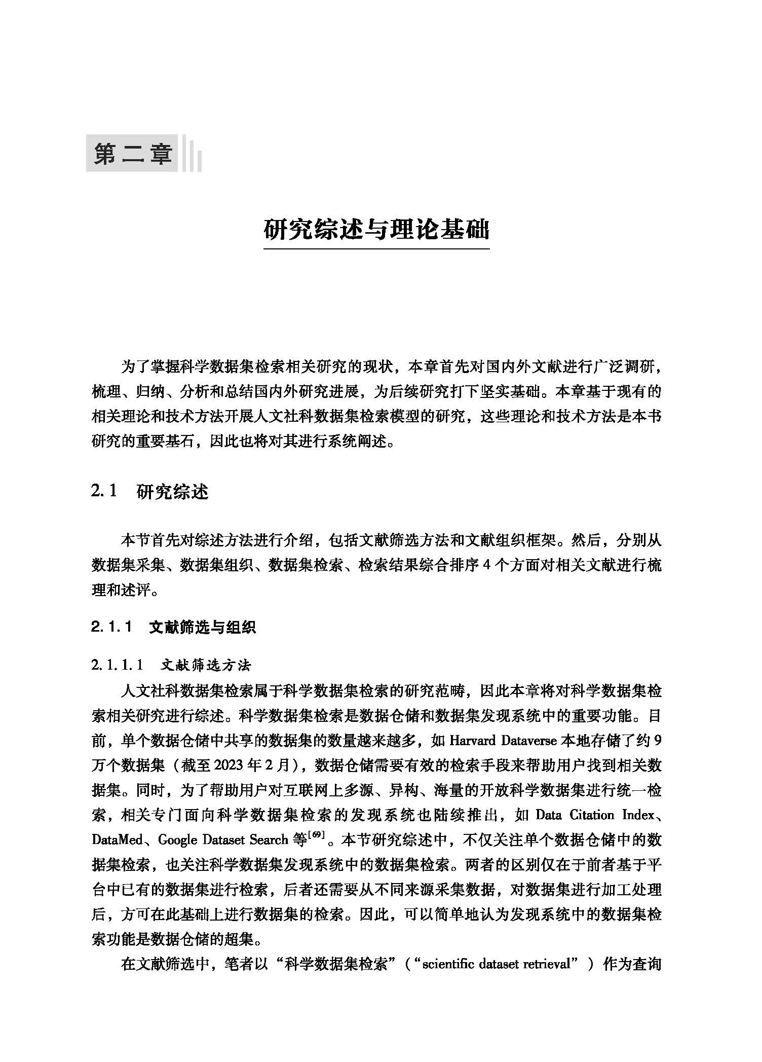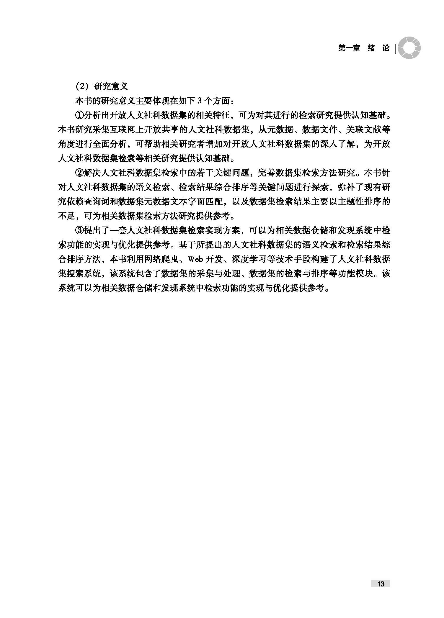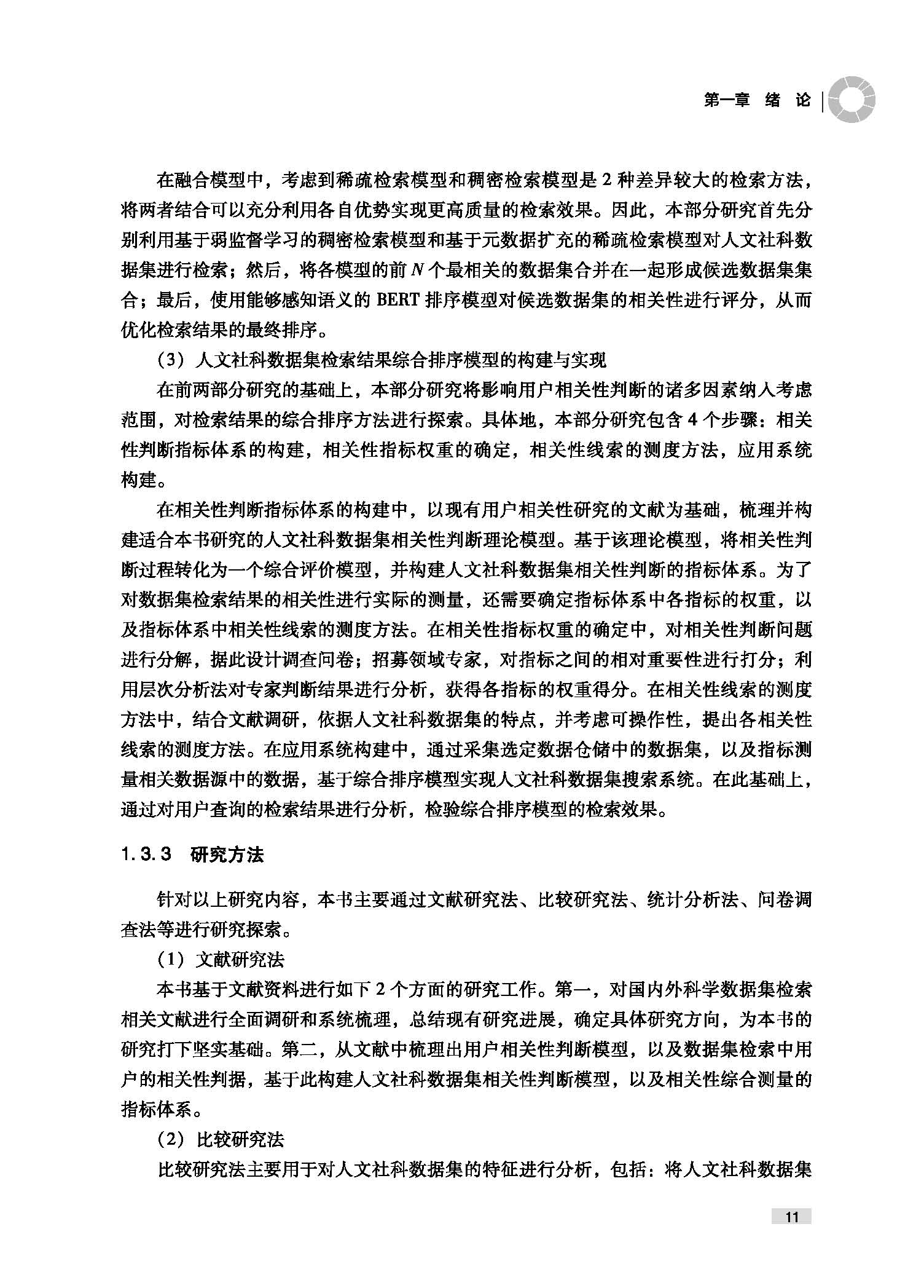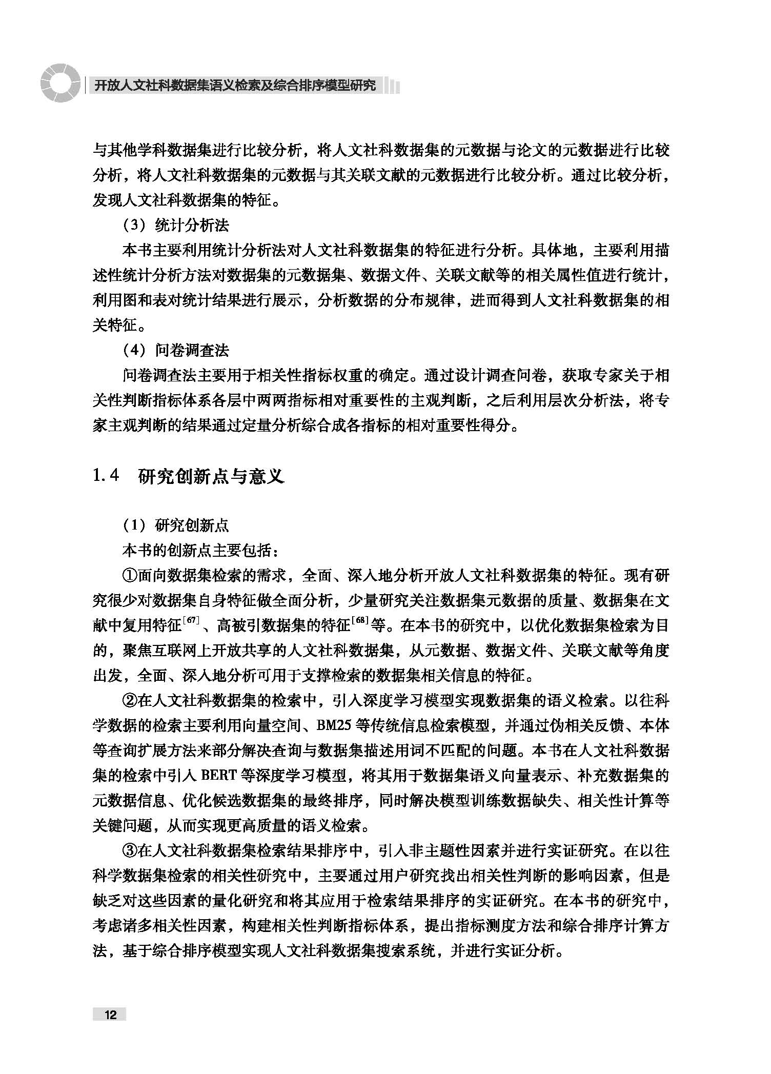 \\\"第一章 绪论 · 1. 1 研究背景… 1. 2 研究问题与目标.............. .................................... ......... · 6 1. 3 研究设计.............. · …7 1. 3. 1 研究内容 ...... …7 1. 3. 2 研究路线 …9 1. 3. 3 研究方法 11 1. 4 研究创新点与意义 12 第二章 研究综述与理论基础 14 2. 1 研究综述…...........................................................................” 2.1. 1 文献筛选与组织 14 2.1. 2 数据集采集 … 16 2.1. 3 数据集组织 18 2.1.4 数据集检索 ........ ·22 2.1. 5 检索结果综合排序 25 2. 2 理论基础与技术方法 28 2.2. 1 相关性判断模型 … 28 2.2.2 信息检索模型 ........ ·31 2.2.3 预训练语言模型 … 34 2. 3 本章小结… ............... … 36 第三章 面向数据集检索的人文牡科组据集的特征研究 38 3. 1 研究思路…· …..38 3. 2 数据采集与预处理 .........… 40 。| 开以社棚酿酒义检索腊合 3.2. 1 数据的采集 ......... 4 3.2. 2 数据的预处理 … 45 3.2. 3 数据的分布情况 46 3. 3 人文社科数据集的元数据特征分析 48 3.3. 1 领域元数据的使用情况 48 3.3. 2 元数据宇段的完整性 51 3.3. 3 主题元数据宇段的信息量 54 3. 4 人文社科数据集的数据文件特征分析 57 3.4.1 数据文件的缺失情况… 57 3.4. 2 数据文件的类型分布… 58 3.4. 3 数据文件的开放程度 60 3.4.4 数据集与数据文件容量大小 62 3. 5 人文社科数据集的关联文献特征分析 63 3.5. 1 数据集关联文献识别 64 3.5. 2 数据集关联文献分布情况 70 3.5. 3 关联文献主题元数据的信息量 71 3.5.4 关联文献与数据集主题元数据的相似度 74 3. 6 本章小结 77 第四章 基于深度学习的人文社科数据集语义检索方法研 究 80 4. 1 研究思路…· ….. 80 4. 2 测评数据集的构建 .............. · 82 4.2. 1 人文社科数据集的采集 83 4.2. 2 用户需求与查询的构造 85 4.2. 3 检索结果池与相关性标注 87 4.2.4 模型检索效果的评价指标 89 4. 3 基于弱监督学习的数据集稠密检索方法 89 4.3. 1 检索模型设计 … 90 4.3. 2 实验设置 … 94 4.3. 3 模型效果分析 95 4. 4 基于无数据扩充的数据集稀疏检索方法 99 4.4. 1 检索模型设计 ........ ·99 4.4. 2 实验设置 …..102 4.4. 3 模型效果分析 ............. ......................................... 103 2 目 录 4. 5 融合稠密与稀疏模型的数据集检索方法… 105 4.5. 1 检索模型设计 106 4.5. 2 实验设置 108 4.5. 3 模型效果分析 110 4. 6 本章小结 … 113 第五章 人文祉科数据集检索结果综合排序模型的构建与实现 116 5. 1 研究思路 ......................... ....... ......................... 116 5. 2 相关性判断指标体系的构建 .................................................. · 117 5.2. 1 相关性判断理论模型 118 5.2. 2 相关性判断指标体系 ............... ........... ....... 119 5.2. 3 综合排序的相关性计算 123 5. 3 相关性指标权重的确定 124 5.3. 1 层次分析法的基本原理 124 5.3. 2 建立递阶层次结构 … 125 5.3. 3 获取专家判断矩阵 · .. 126 5.3.4 计算单层指标相对权重 ....................................... 126 5.3. 5 计算线索指标综合权重 127 5.3. 6 专家群组决策结果 130 5. 4 相关性线索的测度方法 131 5.4. 1 主题性的测度 131 5.4. 2 可获得性的测度 · .. 132 5.4. 3 质量的测度......... … 134 5.4.4 权威性的测度 ........ · 135 5.4. 5 新颖性的测度 137 5.4. 6 可理解性的测度 138 5. 5 基于综合排序的人文社科数据集搜索系统构建… 140 5.5. 1 系统设计与实现 · .. 140 5.5. 2 检索效果分析 ......... ........ .................................... 144 5. 6 本章小结 149 3 。| 开以社棚酿酒义检索腊合 参考文献 156 附录 A 文献筛选的检索式 176 附录 B 采集数据仓储列表 178 附录 C 数据仓储元数据到都柏林核心元数据的映射规则… 182 附录 D 人文社科数据集检索的相关性指标权重调查问卷 186 \\\"