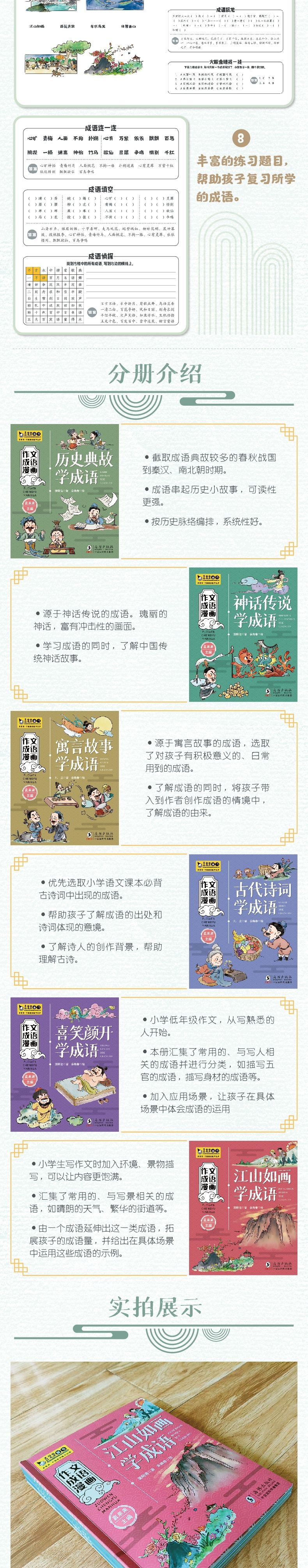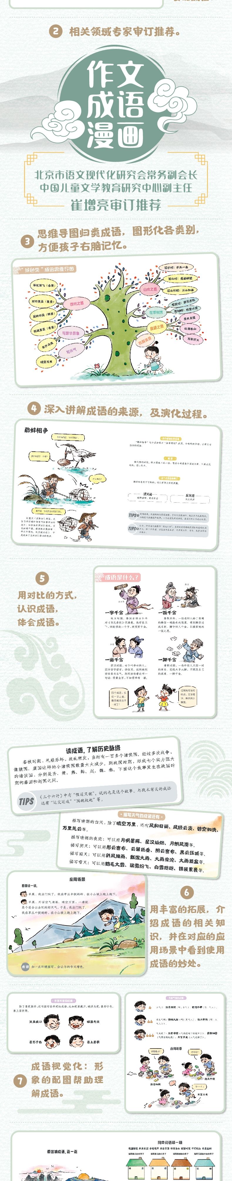 分册介绍: 历史典故学成语 截取成语典故较多的春秋战国到秦汉、南北朝时期。 成语串起历史小故事,可读性更强。 按历史脉络编排,系统性好。 神话传说学成语 源于神话传说的成语。瑰丽的神话,富有冲击性的画面。 学习成语的同时,了解中国传统神话故事。 寓言故事学成语 源于寓言故事的成语,选取了对孩子有积极意义的、日常用到的成语。 了解成语的同时,将孩子带入到作者创作成语的情境中,了解成语的由来。 古代诗词学成语 优先选取小学语文课本必背古诗词中出现的成语。 帮助孩子了解成语的出处和诗词体现的意境。 了解诗人的创作背景,帮助理解古诗。 喜笑颜开学成语 小学低年级作文,从写熟悉的人开始。 本册汇集了常用的、与写人相关的成语并进行分类,如描写五官的成语,描写身材的成语等。 加入应用场景,让孩子在具体场景中体会成语的运用 江山如画学成语 小学生写作文时加入环境、景物描写,可以让内容更饱满。 汇集了常用的、与写景相关的成语,如晴朗的天气、繁华的街道等。 由一个成语延伸出这一类成语,拓展孩子的成语量,并给出在具体场景中运用这些成语的示例。