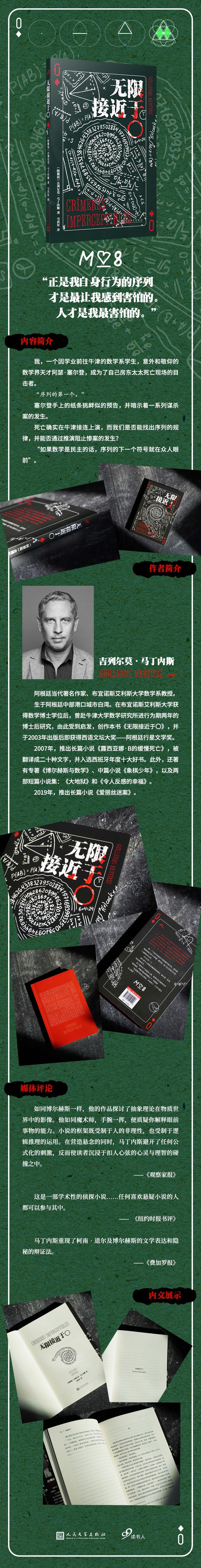 吉列尔莫·马丁内斯(1962— )阿根廷当代著名作家、布宜诺斯艾利斯大学数学系教授。在布宜诺斯艾利斯大学获得数学博士学位后,曾赴牛津大学数学研究所进行为期两年的博士后研究,由此受到启发,创作小说《无限接近于〇》。该书于2003年出版后即获得当年度西语文坛大奖——阿根廷行星文学奖。2007年,推出长篇小说《露西亚娜·B的缓慢死亡》,被翻译成二十种文字,并入选当年西班牙年度十大好书。此外,还著有专著《博尔赫斯与数学》、中篇小说《象棋少年》,以及两部短篇小说集:《大地狱》和《令人反感的幸福》。2019年,推出长篇小说《爱丽丝迷案》。